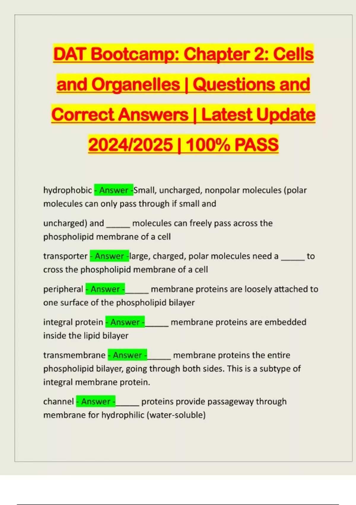 DAT Bootcamp: Chapter 2: Cells and Organelles | Questions and Correct Answers | Latest Update 2024/2025 | 100% PASS hydrophobic - Answer -Small, uncharged, nonpolar molecules (polar molecules can only pass through if small and uncharged) and _____ molecules can freely pass across the phospholipid membrane of a cell transporter - Answer -large, charged, polar molecules need a _____ to cross the phospholipid membrane of a cell peripheral - Answer -_____ membrane proteins are loosely attached to one surface of the phospholipid bilayer integral protein - Answer -_____ membrane proteins are embedded inside the lipid bilayer transmembrane - Answer -_____ membrane proteins the entire phospholipid bilayer, going through both sides. This is a subtype of integral membrane protein. channel - Answer -_____ proteins provide passageway through membrane for hydrophilic (water-soluble)substances (polar, and charged). recognition - Answer -_____ proteins include the majorhistocompatibility complex (MHC) on macrophages used to distinguish between self and foreign; they are glycoproteins due to oligosaccharides attached. major histo-compatibility complex (MHC) - Answer -the _____ on macrophages is used to distinguish between self
