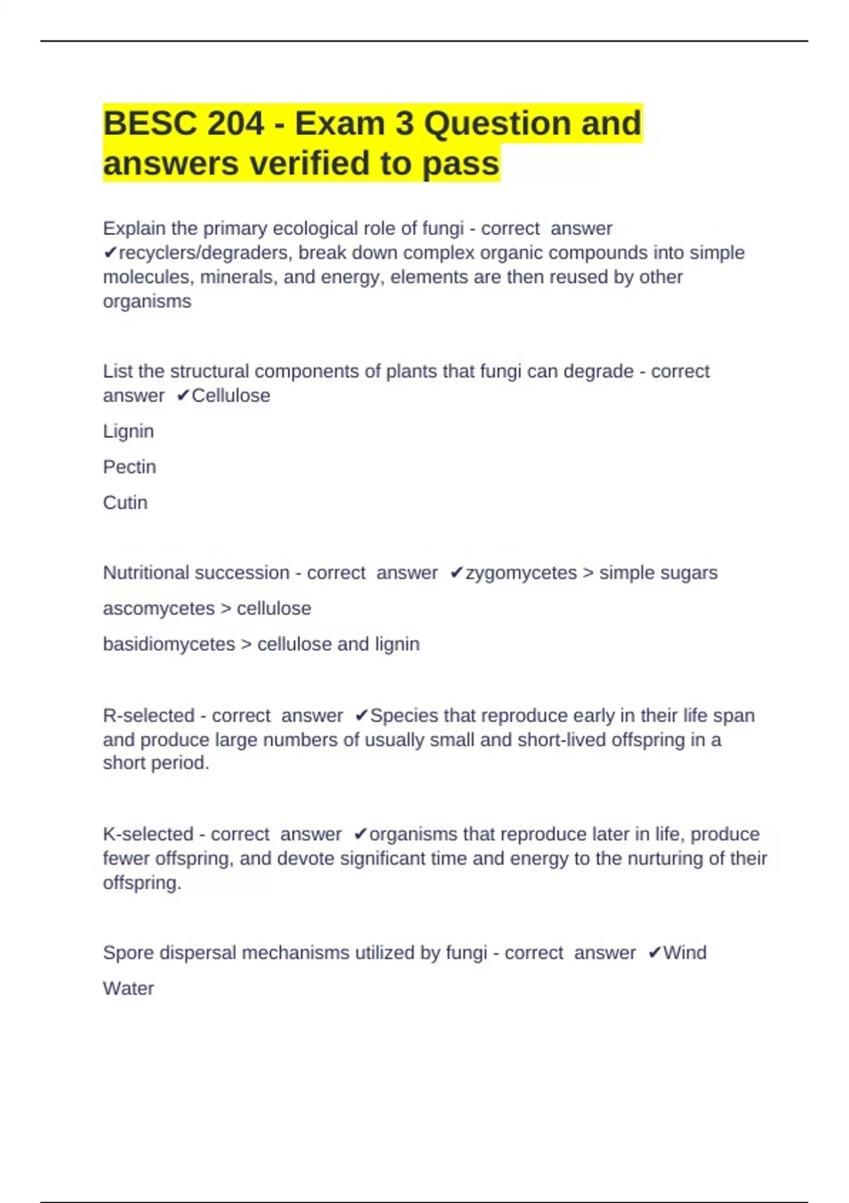 BESC 204 - Exam 3 Question and answers verified to pass Explain the primary ecological role of fungi - correct answer recyclers/degraders, break down complex organic compounds into simple molecules, minerals, and energy, elements are then reused by other organisms List the structural components of plants that fungi can degrade - correct answer Cellulose Lignin Pectin Cutin Nutritional succession - correct answer zygomycetes > simple sugars ascomycetes > cellulose basidiomycetes > cellulose and lignin R-selected - correct answer Species that reproduce early in their life span and produce large numbers of usually small and short-lived offspring in a short period. K-selected - correct answer organisms that reproduce later in life, produce fewer offspring, and devote significant time and energy to the nurturing of their offspring.
