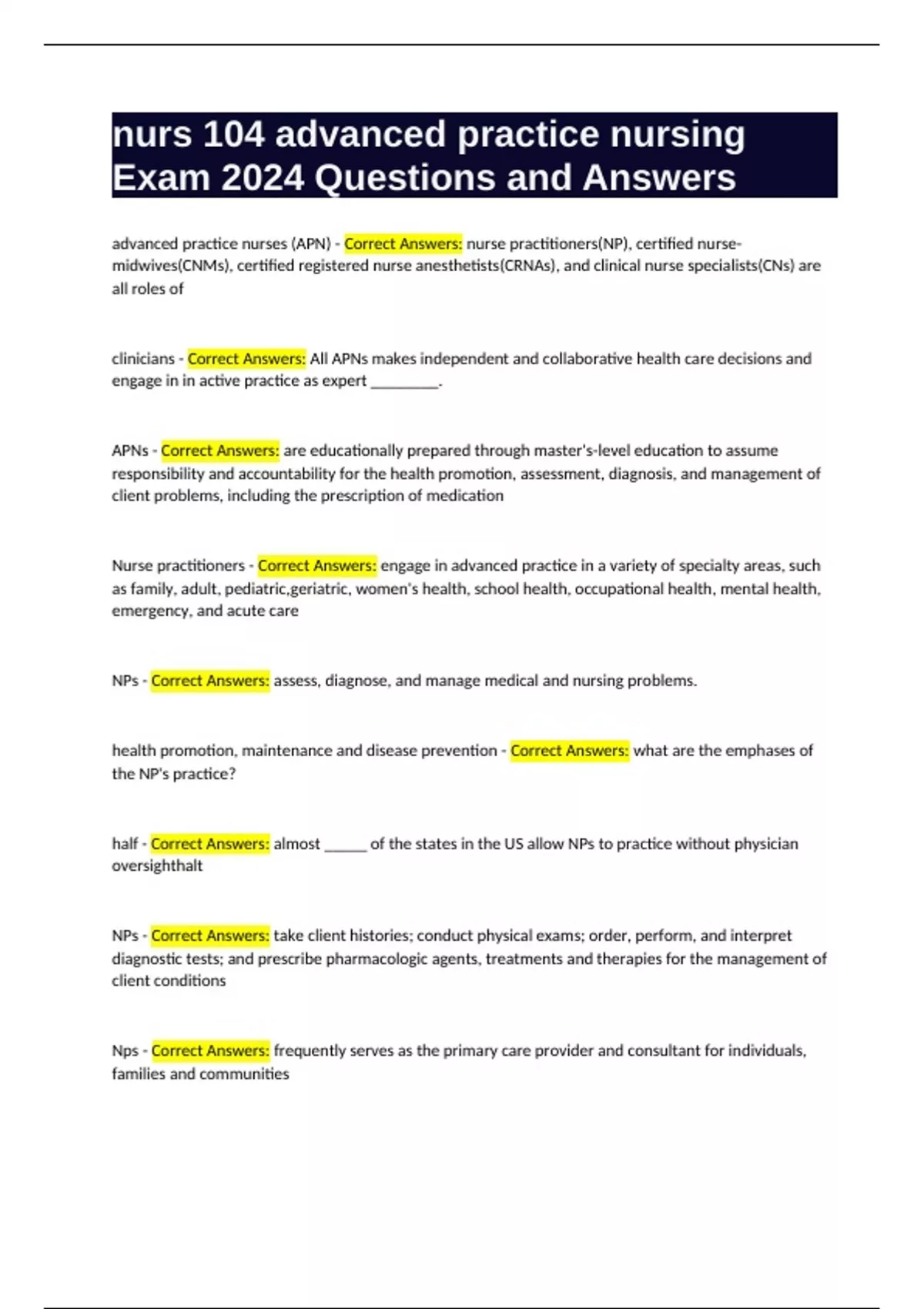 Nurse practitioners - Correct Answers: engage in advanced practice in a variety of specialty areas, such