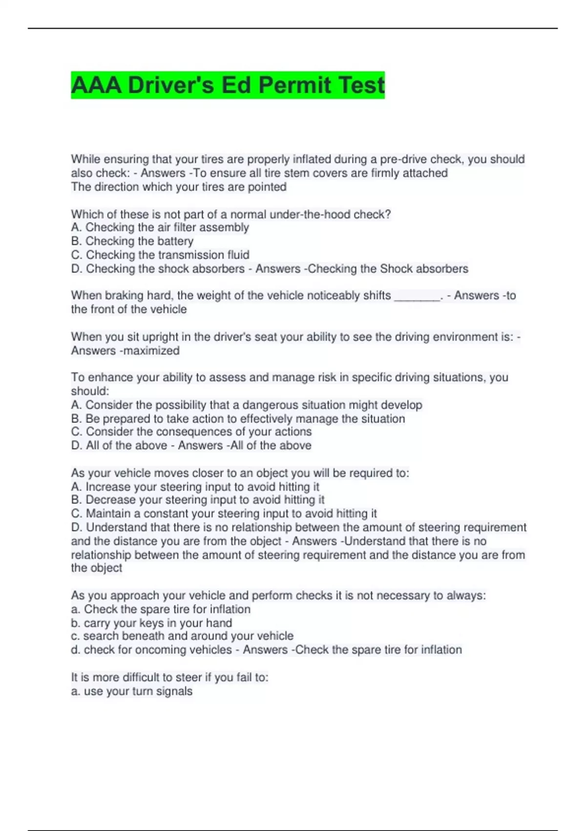 AAA Driver-s Ed Permit Test 100% solved