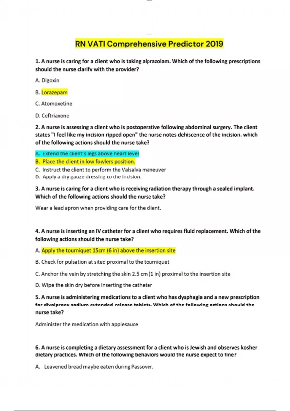 lOMoARcPSD| lOMoARcPSD| RN VATI Comprehensive Predictor 2019 1. A nurse is caring for a client who is taking alprazolam. Which of the following prescriptions should the nurse clarify with the provider? A. Digoxin B. Lorazepam C. Atomoxetine D. Ceftriaxone 2. A nurse is assessing a client who is postoperative following abdominal surgery. The client states "I feel like my incision ripped open" the nurse notes dehiscence of the incision. which of the following actions should the nurse take? A. Extend the client’s legs above heart level B. Place the client in low fowlers position. C. Instruct the client to perform the Valsalva maneuver D. Apply a dry gauze dressing to the incision. 3. A nurse is caring for a client who is receiving radiation therapy through a sealed implant. Which of the following actions should the nurse take? Wear a lead apron when providing care for the client. 4. A nurse is inserting an IV catheter for a client who requires fluid replacement. Which of the following actions should the nurse take? A. Apply the tourniquet 15cm (6 in) above the insertion site B. Check for pulsation at sited proximal to the tourniquet C. Anchor the vein by stretching the skin 2.5 cm (1 in) proximal to the insertion site D. Wipe the skin dry before inserting the catheter 5. A nurse is administering medications to a client who has dysphagia and a new prescription for divalproex sodium extended-release tablets. Which of the following actions should the nurse take? Administer the medication with applesauce 6. A nurse is completing a dietary assessment for a client who is Jewish and observes kosher dietary practices. Which of the following behaviors would the nurse expect to fine? A. Leavened bread maybe eaten during Passover. lOMoARcPSD| B. Shellfish is commonly consumed in the diet. C. Meat and dairy products are eaten separately. D. Fasting from meat occurs during Hanukkah. 7. A nurse is assessing a client who has minor injuries following a motor-vehicle crash and appears agitated and apprehensive. The nurse identifies that the client is in the arm stage of general adaptation syndrome and should expect which of the following findings. Tachycardia 8. A nurse is caring for a client who has a femur fracture and is on bedrest with Buck’s extension traction. which of the following actions should the nurse take? A. Inspect the client’s skin under the device every 8 hours 9. A charge nurse is creating assignments for the next shift for several nurses and one of them is pregnant. Which of the following clients should the charge nurse assign to a nurse who is not pregnant? A. A 60-year-old client who is recovering from shingles B. A 20-year-old client who is HIV positive C. A 40-year-old client who is suspected of having tuberculosis D. An 80-year-old client who has alcoholic pancreatitis and is being treated for impetigo 10. A nurse is caring for a client who has a partial laryngectomy and is receiving continuous internal feeding at 65 ml/hr through a gastrostomy tube. which of the following findings requires immediate intervention by the nurse? A. The gastric residual volume is 250 mL following two hours of infusion. B. The client is lying in a supine position. C. The infusion pump for administering continuous feeding is turned off. D. Interior feeding bag and tubing are not dated. 11. A nurse is teaching a client about smoking cessation. Which of the following client statements should the nurse identify as an understanding of the teaching? A. If I stop abruptly I cannot use a nicotine replacement. B. After 6 months, my risk of heart disease is the same as that of a nonsmoker C. I will set a specific date to stop smoking D. I will use high carbohydrate snacks as a substitute for cigarette. 12. A nurse has been caring for a female client who has bruises on her arms that are a result of physical abuse by her partner. The client states, "I don't know how much longer I can take lOMoARcPSD| this, but I'm afraid he'll really hurt me if I leave" Which of the following is an appropriate nursing intervention? A. Assist the client to identity personal behaviors that trigger abusive behavior B. Insist that the client report the abusive behavior to the proper authority C. Offer to speak to the client’s partner regarding his abusive behavior D. Help the client to recognize the signs of escalation of abusive behavior 13. A client who is 8 hr postpartum asks the nurse if she will need to receive Rh immune globulin. The client is gravid 2, para 2, and her blood type is AB negative. The newborn's blood type is B Positive. Which of the following statements is appropriate? A. "You only need to receive Rh immune globulin if you have a positive blood type. " B. "You should receive Rh immune globulin within 72 hours of delivery." C. "Both you and your baby should receive Rh immune globulin at your week appointment." D. "immune globulin is not necessary since this is your second pregnancy." 14. A client hospitalized for a bone marrow transplant is in protective isolation while undergoing total body radiation and intense chemotherapy. The client’s sibling comes to visit but has obvious manifestations of an upper respiratory infection. which of the following nursing actions is appropriate at this time? A. Allow the sibling to wave at the client through the window or door. B. Allow the sibling to visit after donning a sterile gown, mask and gloves, but prohibit physical contact. C. D. 15. A nurse is planning care for a client who takes haloperidol for the treatment of schizophrenia. which of the following should the nurse include in the plan of care? A. Monitor the client for hypothermia B. Screen the client for tardive dyskinesia C. Check the client’s weekly potassium level D. Schedule the client for a 24hr urine collection 16. A nurse is performing a vision screening for a client. which of the following findings should the nurse identify as an indication that the client has cataracts? A. Report of a chronic dull 