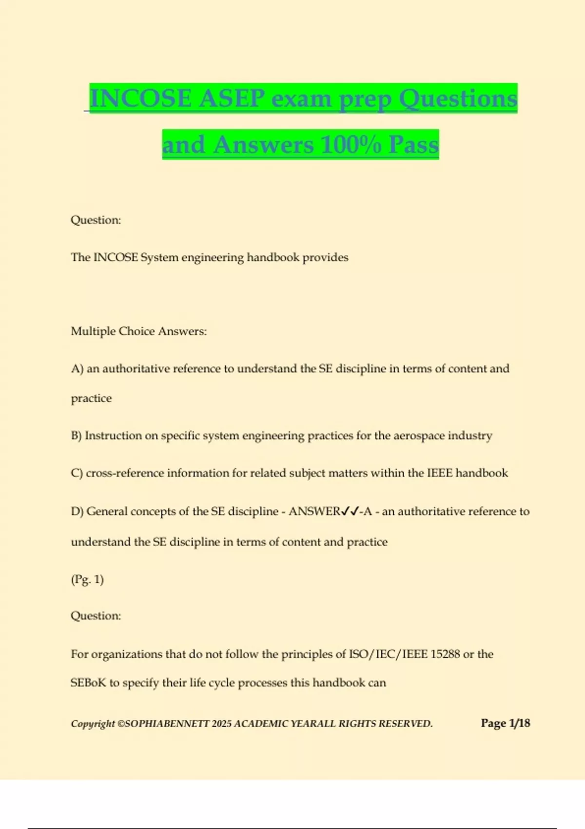 INCOSE ASEP exam prep Questions and Answers 100% Pass Question: The INCOSE System engineering handbook provides Multiple Choice Answers: A) an authoritative reference to understand the SE discipline in terms of content and practice B) Instruction on specific system engineering practices for the aerospace industry C) cross-reference information for related subject matters within the IEEE handbook D) General concepts of the SE discipline - ANSWER-A - an authoritative reference to understand the SE discipline in terms of content and practice (Pg. 1) Question: For organizations that do not follow the principles of ISO/IEC/IEEE 15288 or the SEBoK to specify their life cycle processes this handbook can Copyright ©SOPHIABENNETT 2025 ACADEMIC YEARALL RIGHTS RESERVED. Page 2/18 Multiple Choice Answers: A) add significant value in new domains, if appropriately applied B) provide conflicting information that may lead to workplace confusion C) result in the firing of top executives D) provide insightful knowledge to more strategic negotiation skills - ANSWER-A - add significant value in new domains, if appropriately applied (Pg. 1) Question: ISO/IEC/IEEE 15288 identifies four process groups to support SE Multiple Choice Answers: A) Technical processes, Agreement processes, Distribution processes, Management Processes B) Technical processes, Technical management processes, Agreement processes, Organizational project-enabling processes C) Technical processes, Resource allocation processes, Agreement processes, Organizational project-enabling processes Copyright ©SOPHIABENNETT 2025 ACADEMIC YEARALL RIGHTS RESERVED. Page 3/18 D) Technical processes, Technical management processes, Agreement processes, Resource allocation processes - ANSWER-B) Technical processes, Technical management processes, Agreement processes, Organizational project-enabling processes Question: An IPO diagram includes the following Multiple Choice Answers: A) all inputs, process activities, and possible outputs B) key inputs, process activities, and resulting outputs C) all inputs, predictable activities, and required outputs D) key inputs, process activities, and possible outputs v - ANSWER-B) key inputs, process activities, and resulting outputs (Pg. 3) Question: Typically IPO diagrams do not include Multiple Choice Answers: A) Inputs and Outputs Copyright ©SOPHIABENNETT 2025 ACADEMIC YEARALL RIGHTS RESERVED. Page 4/18 B) Activities C) Controls and Enablers D) Outputs - ANSWER-C - Controls and Enablers (Pg. 3) Question: One of a system engineer's first and most important responsibilities on a project is Multiple Choice Answers: A) To establish nomenclature and terminology that support clear, unambiguous communication and definition of the system and its elements, functions, operations, and associated processes. B) To establish work distribution and technical management foundations in order to insure proper allocations of resources C) To commission the creation of a committee D) To create an excell spreadsheet - ANSWER-A) To establish nomenclature and terminology that support clear, unambiguous communication and definition of the system and its elements, functions, operations, and associated processes. (Pg 4) Question: Copyright ©SOPHIABENNETT 2025 ACADEMIC YEARALL RIGHTS RESERVED. Page 5/18 As more systems engineers accept and use common terminology, SE will experience improvements in communications, understandings, and, ultimately Multiple Choice Answers: A) Productivity B) Knowledge C) Work ethic D) Manpower - ANSWER-A) Productivity (