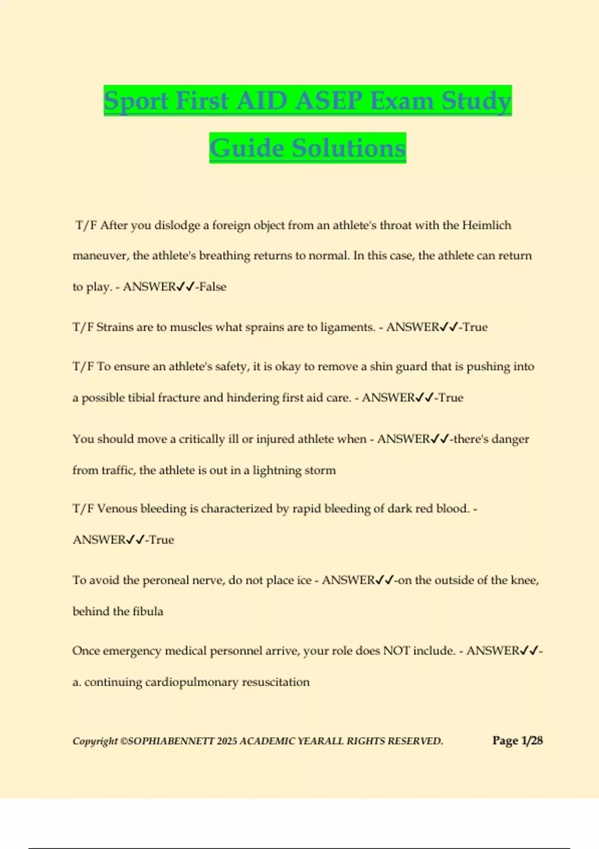 Sport First AID ASEP Exam Study Guide Solutions T/F After you dislodge a foreign object from an athlete's throat with the Heimlich maneuver, the athlete's breathing returns to normal. In this case, the athlete can return to play. - ANSWER-False T/F Strains are to muscles what sprains are to ligaments. - ANSWER-True T/F To ensure an athlete's safety, it is okay to remove a shin guard that is pushing into a possible tibial fracture and hindering first aid care. - ANSWER-True You should move a critically ill or injured athlete when - ANSWER-there's danger from traffic, the athlete is out in a lightning storm T/F Venous bleeding is characterized by rapid bleeding of dark red blood. - ANSWER-True To avoid the peroneal nerve, do not place ice - ANSWER-on the outside of the knee, behind the fibula Once emergency medical personnel arrive, your role does NOT include. - ANSWER- a. continuing cardiopulmonary resuscitation Copyright ©SOPHIABENNETT 2025 ACADEMIC YEARALL RIGHTS RESERVED. Page 2/28 b. explaining how the injury occurred c. taking charge of crowd control d. describing the first aid care that you provided e. any of the above a An athlete should NOT be allowed to participate if she has - ANSWER-a. a cold b. ringing in her ears c. slight shoulder pain after, but not during, activity d. a bruised fingernail e. b and c b Which of the following items should be included in your first-aid kit? - ANSWER-a. sterile gauze b. safety glasses c. iodine Copyright ©SOPHIABENNETT 2025 ACADEMIC YEARALL RIGHTS RESERVED. Page 3/28 d. all of the above e. a and b d While performing the emergency action steps for a responsive athlete, you ask if she's okay, and she responds "yes," but she is gasping and clutching her throat. Your next action should be to. - ANSWER-a. slap the athlete on the back b. check for signs of circulation c. begin the Heimlich maneuver d. encourage the athlete to cough e. none of the above e T/F To protect against blood-borne pathogens, clean contaminated floors, equipment, and other surfaces with a 1-to-100 solution of bleach and water, and then immediately wipe the items with sterile gauze. - ANSWER-False A basketball player has dislocated a finger and is looking pale and feeling nauseated. Your first step is to. - ANSWER-a. apply ice, and then send the athlete to a physician Copyright ©SOPHIABENNETT 2025 ACADEMIC YEARALL RIGHTS RESERVED. Page 4/28 b. place the athlete on her side, and cover her with a blanket c. splint the finger, apply ice, and send her to a physician d. treat the athlete for shock, and call for emergency medical assistance e. do none of the above d Once a superficial wound stops bleeding, - ANSWER-a. pull out any embedded objects b. clean the wound c. tape the edges of the wound together d. do all of the above a A wrestler with a spine injury is being treated in the position he fell in, but he stops breathing. Position the athlete. NOT C - ANSWER-a. faceup and flat on his back b. in the recovery position c. faceup with his head elevate