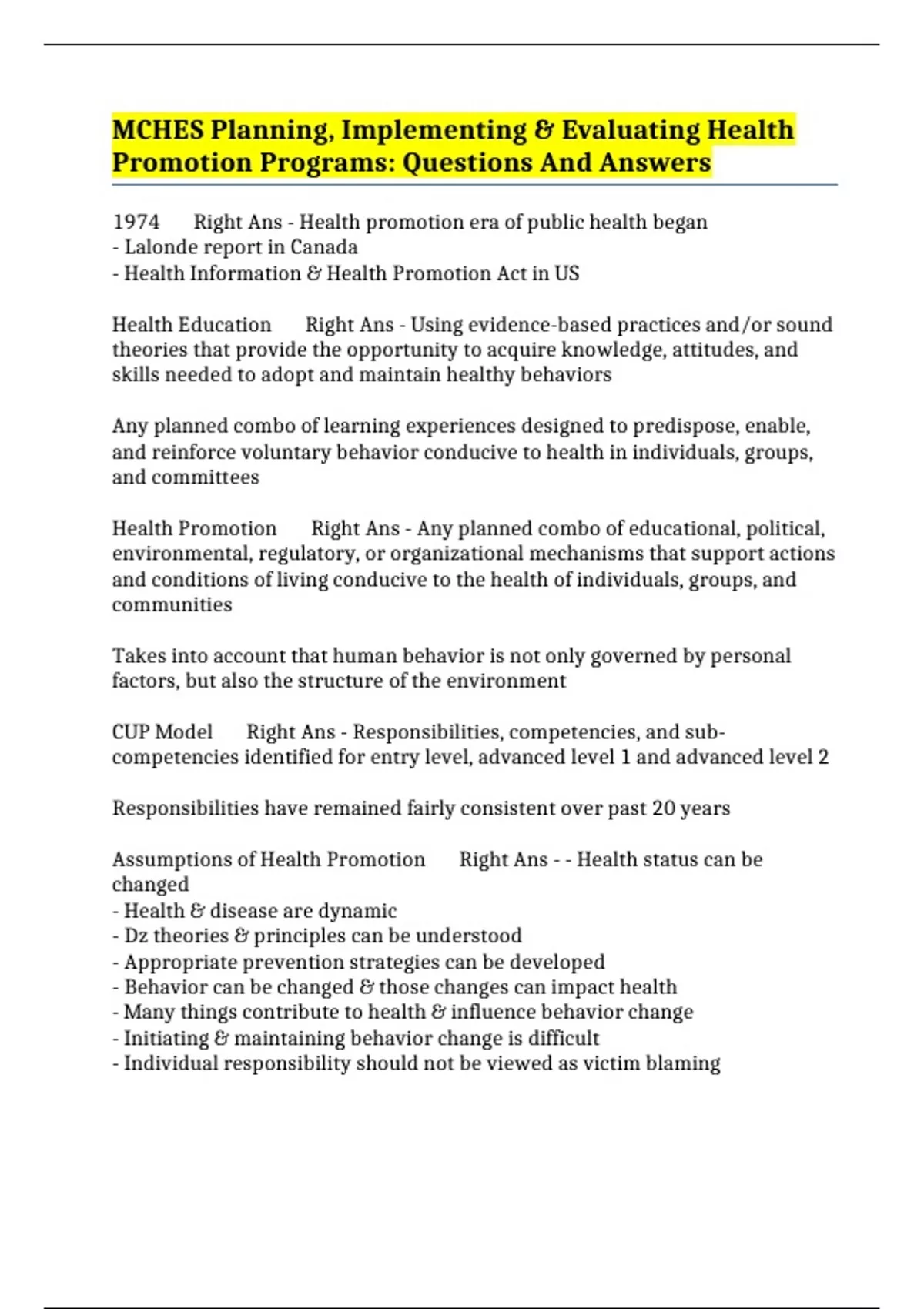 Assumptions of Health Promotion Right Ans - - Health status can be
