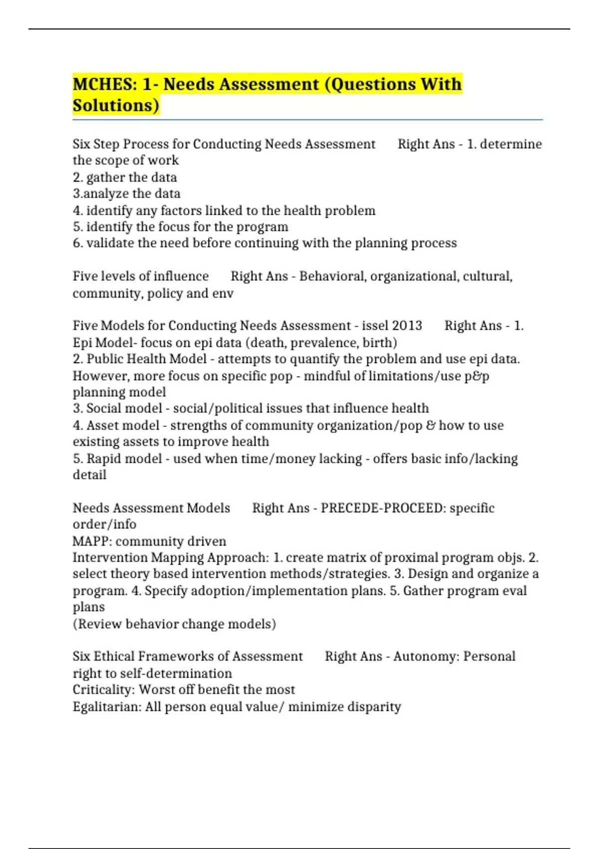 MCHES: 1- Needs Assessment (Questions With Solutions)