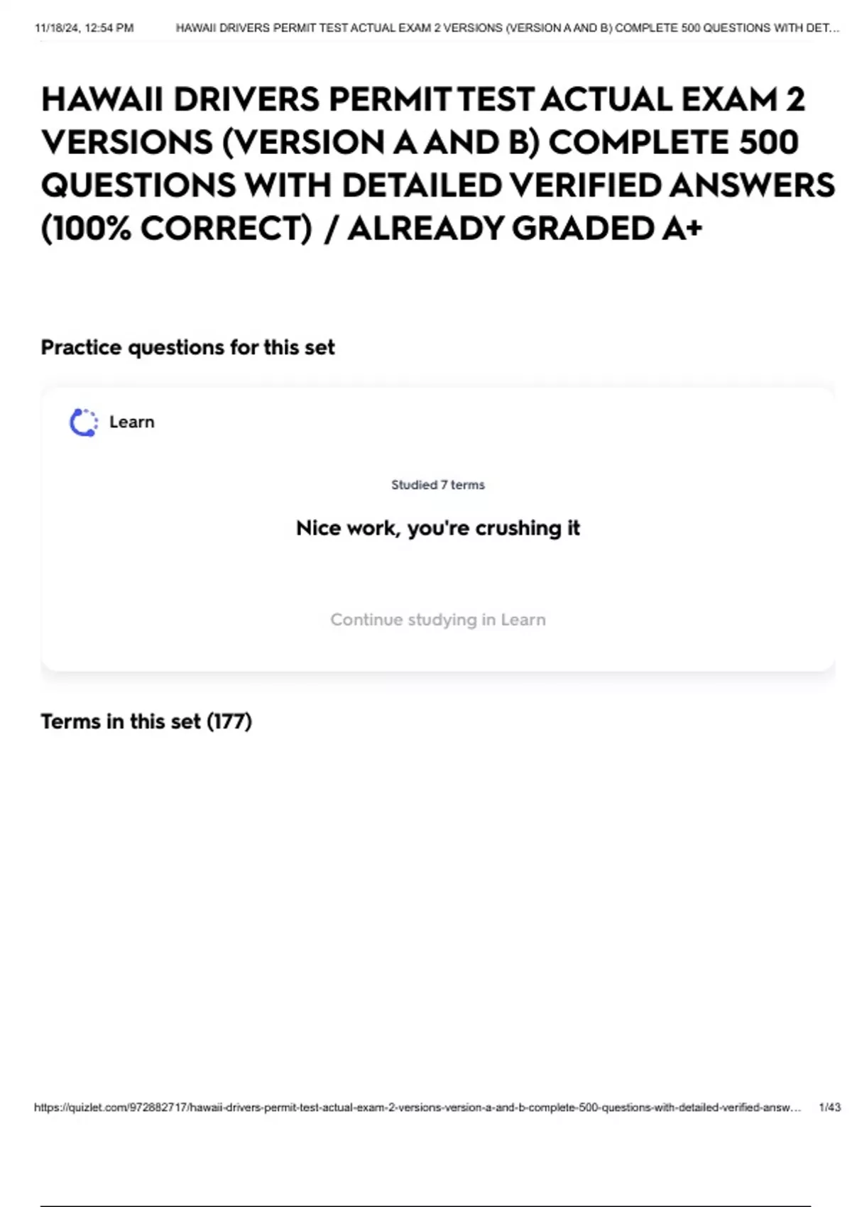 , 11/18/24, 12:54 PM HAWAII DRIVERS PERMIT TEST ACTUAL EXAM 2 VERSIONS (VERSION A AND B) COMPLETE 500 QUESTIONS WITH DET…