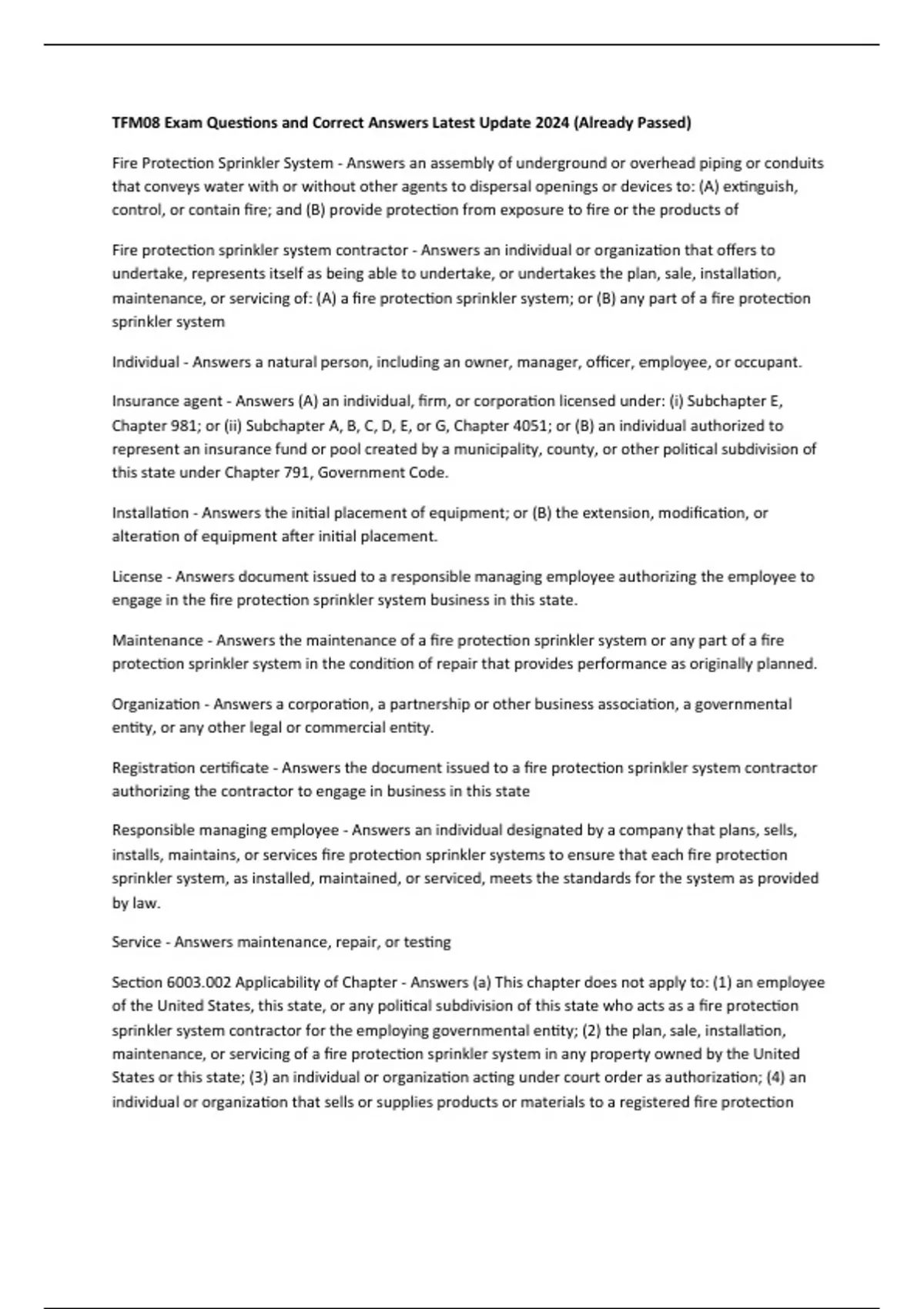 servicing fire protection sprinkler systems; and (2) the requirements for the plan, sale, installation,