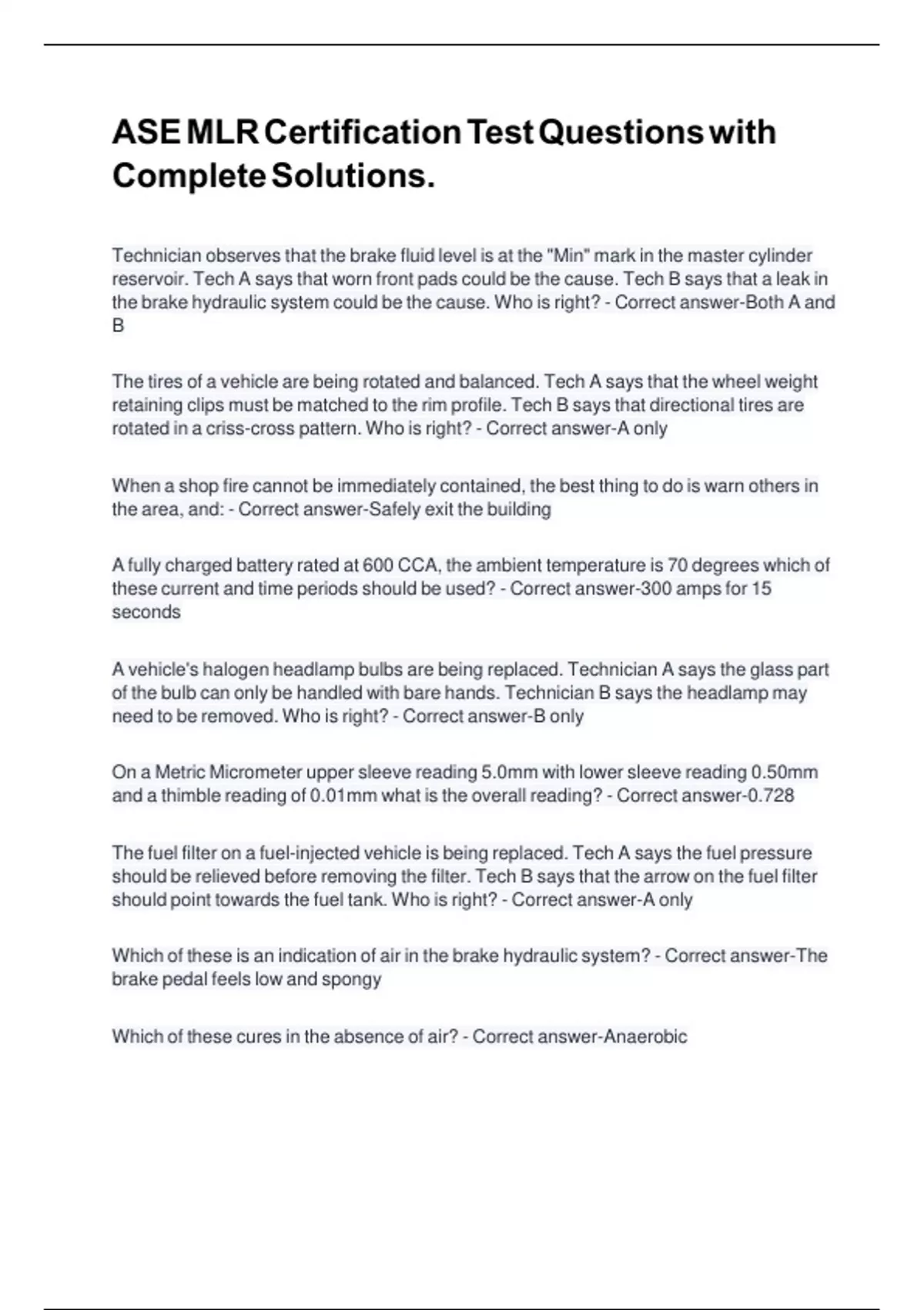 ASE MLR Certification Test Questions with Complete Solutions. Technician observes that the brake fluid level is at the "Min" mark in the master cylinder reservoir. Tech A says that worn front pads could be the cause. Tech B says that a leak in the brake hydraulic system could be the cause. Who is right? - Correct answer-Both A and B The tires of a vehicle are being rotated and balanced. Tech A says that the wheel weight retaining clips must be matched to the rim profile. Tech B says that directional tires are rotated in a criss-cross pattern. Who is right? - Correct answer-A only When a shop fire cannot be immediately contained, the best thing to do is warn others in the area, and: - Correct answer-Safely exit the building A fully charged battery rated at 600 CCA, the ambient temperature is 70 degrees which of these current and time periods should be used? - Correct answer-300 amps for 15 seconds A vehicle's halogen headlamp bulbs are being replaced. Technician A says the glass part of the bulb can only be handled with bare hands.