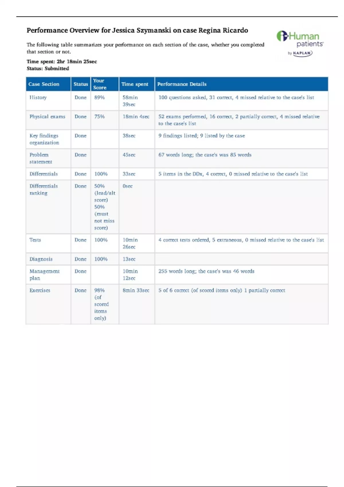 Performance Overview for Jessica Szymanski on case Regina Ricardo