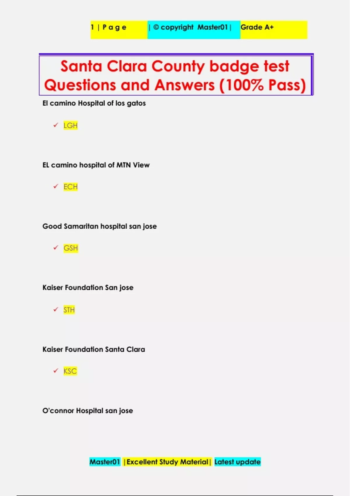 El camino Hospital of los gatos LGH EL camino hospital of MTN View ECH Good Samaritan hospital san jose GSH Kaiser Foundation San jose STH Kaiser Foundation Santa Clara KSC O'connor Hospital san jose Master01 |Excellent Study Material| Latest update 1 | P a g e | © copyright Master01| Grade A+ OCH Palo alto vetrans administration hospitall PAV Regional medical center of san jose RSJ Saint Louise Regional medical center/ gilroy SLH Santa Clara Valley medical center /san jose VMC Standford university medical center Palo ALto Hazel h