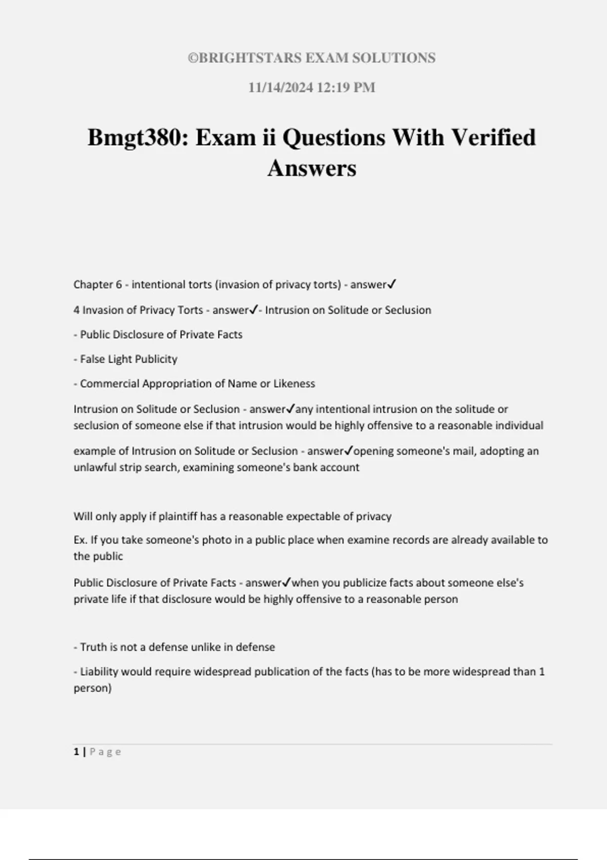 Chapter 6 - intentional torts (invasion of privacy torts) - answer✔