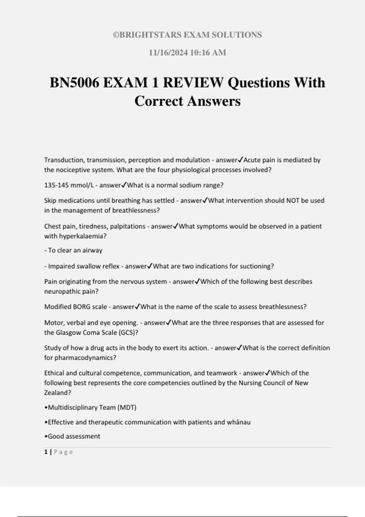 ©BRIGHTSTARS EXAM SOLUTIONS 11/16/2024 10:16 AM 1 | P a g e BN5006 EXAM 1 REVIEW Questions With Correct Answers Transduction, transmission, perception and modulation - answerAcute pain is mediated by the nociceptive system. What are the four physiological processes involved? 135-145 mmol/L - answerWhat is a normal sodium range? Skip medications until breathing has settled - answerWhat intervention should NOT be used in the management of breathlessness? Chest pain, tiredness, palpitations - answerWhat symptoms would be observed in a patient with hyperkalaemia? - To clear an airway - Impaired swallow reflex - answerWhat are two indications for suctioning? Pain originating from the nervous system - answerWhich of the following best describes neuropathic pain? Modified BORG scale - answerWhat is the name of the scale to assess breathlessness? Motor, verbal and eye opening. - answerWhat are the three responses that are assessed for the Glasgow Coma Scale (GCS)? Study of how a drug acts in the body to exert its action. - answerWhat is the correct definition for pharmacodynamics? Ethical and cultural competence, communication, and teamwork - answerWhich of the following best represents the core competencies outlined by the Nursing Council of New Zealand? •Multidisciplinary Team (MDT) •Effective and therapeutic communication with patients and whānau •Good assessment