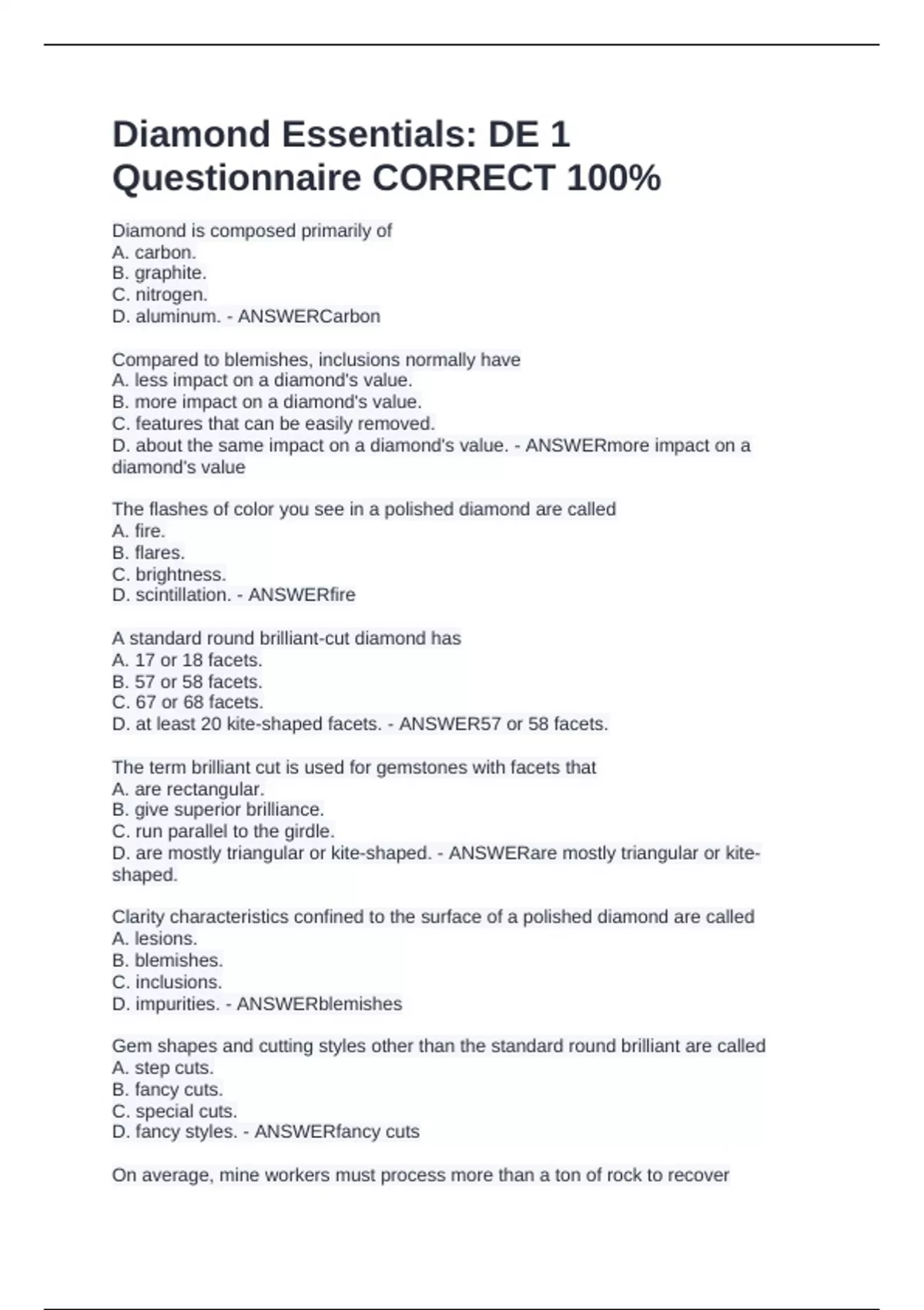 Diamond Essentials: DE 1 Questionnaire CORRECT 100%