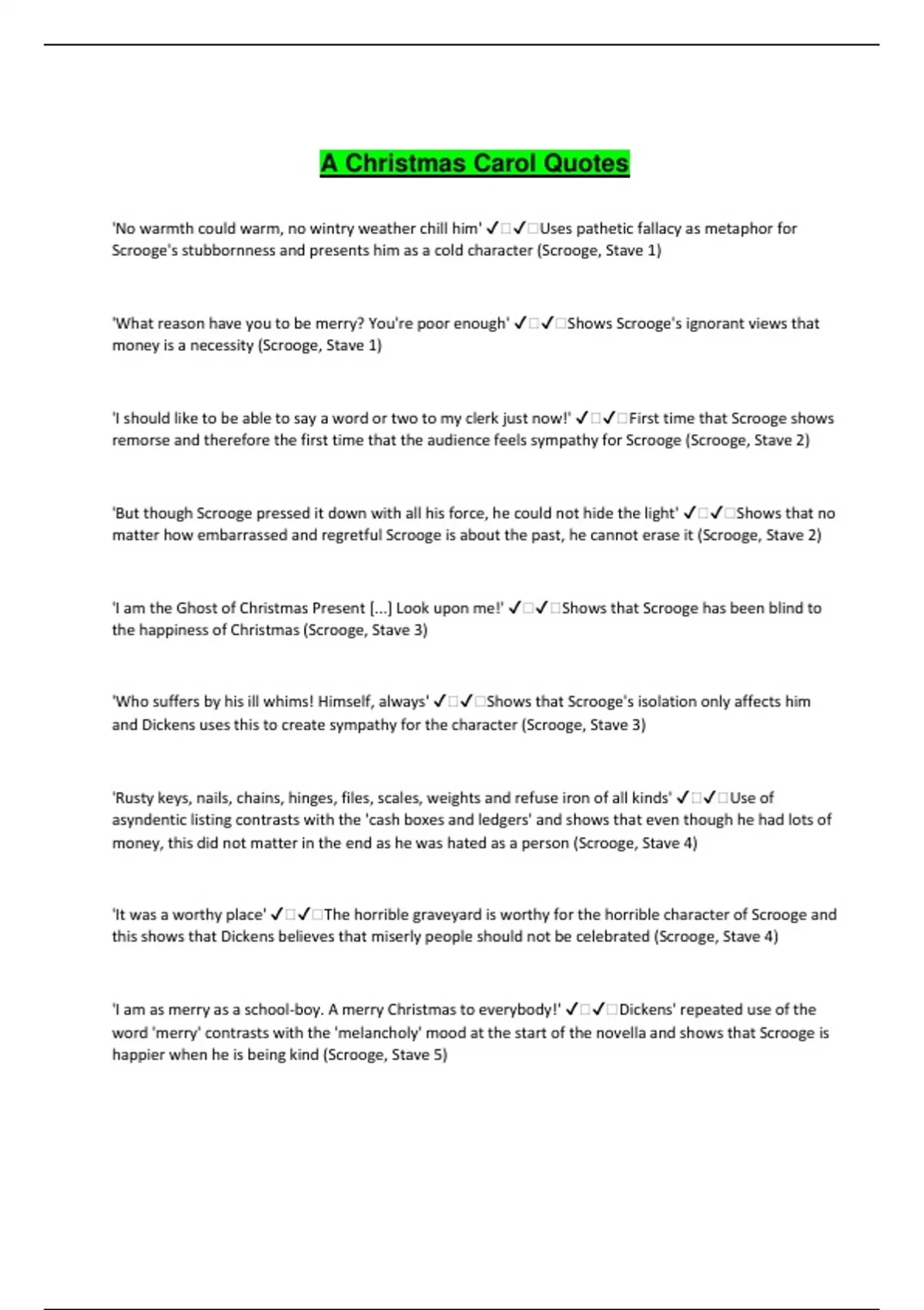 A Christmas Carol Quotes 'No warmth could warm, no wintry weather chill him' ️️Uses pathetic fallacy as metaphor for Scrooge's stubbornness and presents him as a cold character (Scrooge, Stave 1) 'What reason have you to be merry? You're poor enough' ️️Shows Scrooge's ignorant views that money is a necessity (Scrooge, Stave 1) 'I should like to be able to say a word or two to my clerk just now!' ️️First time that Scrooge shows remorse and therefore the first time that the audience feels sympathy for Scrooge (Scrooge, Stave 2) 'But though Scrooge pressed it down with all his force, he could not hide the light' ️️Shows that no matter how embarrassed and regretful Scrooge is about the past, he cannot erase it (Scrooge, Stave 2) 'I am the Ghost of Christmas Present [...] Look upon me!' ️️Shows that Scrooge has been blind to the happiness of Christmas (Scrooge, Stave 3) 'Who suffers by his ill whims! Himself, always' ️️Shows that Scrooge's isolation only affects him and Dickens uses this to create sympathy for the character (Scrooge, Stave 3) 'Rusty keys, nails, chains, hinges, files, scales, weights and refuse iron of all kinds' ️️Use of asyndentic listing contrasts with the 'cash boxes and ledgers' and shows that even though he had lots of money, this did not matter in the end as he was hated as a person (Scrooge, Stave 4) 'It was a worthy place' ️️The horrible graveyard is worthy for the horrible character of Scrooge and this shows that Dickens believes that miserly people should not be celebrated (Scrooge, Stave 4) 'I am as merry as a school-boy. A merry Christmas to everybody!' ️️Dickens' repeated use of the word 'merry' contrasts with the 'melancholy' mood at the start of the novella and shows that Scrooge is happier when he is being kind (Scrooge, Stave 5) 'buy another coal-scuttle' ️️Contrasts with Scrooge's reluctance to let Bob have more than 'one coal' and shows how much he has changed (Scrooge, Stave 5) 'The clerk [...] involuntarily applauded' ️️Shows that everybody agrees with the idea that Christmas is good, even the poor clerk who will not be able be paid enough to have a lavish Christmas (Bob Cratchit, Stave 1) 'The clerk' ️️Dickens leaves Bob Cratchit nameless in the first stave to show how the impoverished were invisible to the upper class of the time (Bob Cratchit, Stave 1) 'Bob's private property, conferred upon his son and heir in honour of the day' ️️Emphasises Bob's poverty but also shows how the family try their best to look smart on the important day (Bob Cratchit, Stave 3) 'Bob said he didn't think there ever was such a goose cooked' ️️Even is Bob is poor, he is happy and proud of their efforts and this reinforces Dickens' idea that happiness can be obtained without wealth (Bob Cratchit, Stave 3) 'Poor Bob Cratchit' ️️The double meaning of 'poor' evokes feelings of sympathy towards Bob and Dickens uses this to encourage his audience to think about their social responsibility (Bob Cratchit, Stave 4) '"My little, little child!" cried Bob' ️️Shows that Bob is sensitive and this makes the audience feel sympathetic towards him (Bob Cratchit, Stave 4) 'God bless us every one!' ️️Shows that he is able to offer love to 'every one' even in his disabled and impoverished state which highlights how ungenerous Scrooge, an able and well off adult, can be (Tiny Time, Stave 3) 'He hoped the people saw him in the church, because he was a cripple , and it might be pleasant to them to remember upon Christmas Day' ️️This shows how Tiny Tim is thoughtful and rises above his own suffering which once again contrasts with the ignorant nature of Scrooge (Tiny Tim, Stave 3) 'We recollect how patient and how mild he was' ️️Dickens present Tiny Tim as somebody who was remembered fondly and missed by his family and friends which highlights the way that the people who knew Scrooge were glad at his death (Tiny Tim, Stave 4) 'We shall not quarrel easily among ourselves, and forget poor Tiny Tim in doing it' ️️This shows that he is remembered as a peacemaker and somebody that would be ashamed of quarrels (Tiny Tim, Stave 4) 'Mankind was my business' ️️This quote is Dickens talking through Marley to try and show the miserly upper class that other people are more important than money (Marley, Stave 1) 'Incessant torture of remorse' ️️The emotive word 'remorse' is used by Dickens to try and scare the upper class into being more charitable (Marley, Stave 1) 'Rise! and walk with me!' ️️The imperatives 'rise' and 'walk' show that the Ghost is to be obeyed which could symbolise the fact the fact that Scrooge is doomed to repeat his past unless he makes drastic changes (Ghost of Christmas Past, Stave 2) 'One shadow more!' ️️Shows that the Ghost is unsympathetic and unforgiving upper class' mistakes, like Dickens (Ghost of Christmas Past, Stave 2) 'Harmless mirth on everything within its reach' ️️The generous and loving nature of the Ghost contrasts with the cold-hearted way that Scrooge shuts the door on carol singers (Ghost of Christmas Present, Stave 3) 'Are there no prisons?' ️️The way the the Ghost uses Scrooge's words against him shows that he is ashamed of him (Ghost of Christmas Present, Stave 3) 'Still the Ghost pointed with an unmoved finger' ️️This shows that Dickens believes that the rich will not be treated differently in the afterlife, regardless of how much money they have (Ghost of Christmas Future, Stave 4) 'It seemed to scatter gloom and mystery' ️️Dickens portrays the Ghost in a frighting way to scare the upper class of the time, when the supernatural was one of the most talked about and yet most feared topics (Ghost of Christmas Future) "I'll keep my Christmas humour to the last" ️️Positive shows he is persistent with his christmas cheer. "I mean to give him the same chance every year whether he likes it or not." ️
