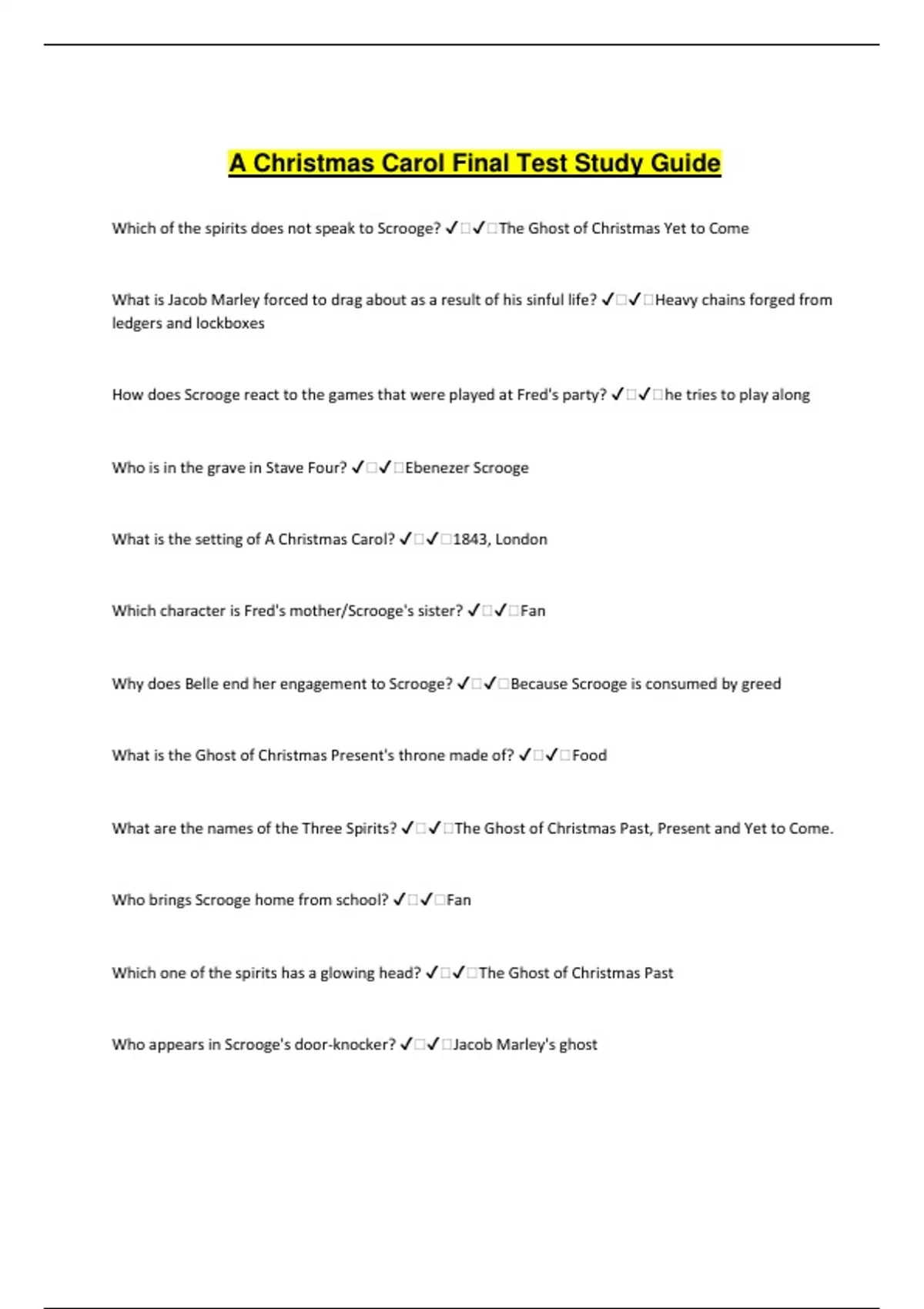 A Christmas Carol Final Test Study Guide Which of the spirits does not speak to Scrooge? ️️The Ghost of Christmas Yet to Come What is Jacob Marley forced to drag about as a result of his sinful life? ️️Heavy chains forged from ledgers and lockboxes How does Scrooge react to the games that were played at Fred's party? ️️he tries to play along Who is in the grave in Stave Four? ️️Ebenezer Scrooge What is the setting of A Christmas Carol? ️️1843, London Which character is Fred's mother/Scrooge's sister? ️️Fan Why does Belle end her engagement to Scrooge? ️️Because Scrooge is consumed by greed What is the Ghost of Christmas Present's throne made of? ️️Food What are the names of the Three Spirits? ️️The Ghost of Christmas Past, Present and Yet to Come. Who brings Scrooge home from school? ️️Fan Which one of the spirits has a glowing head? ️️The Ghost of Christmas Past Who appears in Scrooge's door-knocker? ️️Jacob Marley's ghost When do the Spirits arrive? ️️One Which spirit takes Scrooge to a ship at sea? ️️The Ghost of Christmas Present Which family does the Spirit take Scrooge to revisit? ️️The Cratchits How is Scrooge at the beginning of the story? ️️mean, greedy, unkind What is Scrooge's typical response to "Merry Christmas"? ️️"Bah! Humbug!" Which character utters the famous words, "God bless us, Every one"? ️️Tiny Tim How is Scrooge at the end of the story? ️️changed! Kind, generous. What is the story's conflict? ️️Scrooge is a greedy, unkind man who will suffer the same eternal punishment as Jacob Marley if he can't be convinced to change his ways by the Three Spirits of Christmas. What does the Ghost of Christmas Past symbolize? ️️memory What does the Ghost of Christmas Present symbolize? ️️generosity What does the Ghost of Christmas Yet to Come symbolize? ️️death Who is the first ghost to visit Scrooge? ️️Jacob Marley What does Mrs. Cratchit prepare for the Christmas meal? ️️A Goose What are the names of the children hidden in the robes of Christmas Present? ️️Ignorance and Want Who was Fezziwig's other apprentice ️️Dick Wilkins What did Martha Cratchit do to surprise her father when he came home? ️️She hid from him. Who bought all of Scrooge's belongings? ️️Old Joe Who said: "It is required of every man," the ghost returned, "that the spirit within him should walk abroad among his fellow-men, and travel far and wide; and, if that spirit goes not forth in life, it is condemned to do so after death." ️️Jacob Marley Who said: "The school is not quite deserted," said the Ghost. "A solitary child, neglected by his friends, is left there still." ️️The Ghost of Christmas Past, about young Scrooge at school. Who said: "It matters little," she said, softly. "To you, very little. Another idol has displaced me; and if it can cheer and comfort you in time to come, as I would have tried to do, I have no just cause to grieve." ️️Belle Who said: I will honour Christmas in my heart, and try to keep it all the year. I will live in the Past, the Present, and the Future. The Spirits of all Three shall strive within me. I will not shut out the lessons that they teach. Oh, tell me I may sponge away the writing on this stone!" ️️Scrooge Who said: "But I am sure I have always thought of Christmas time, when it has come round -- apart from the veneration due to its sacred name and origin, if anything belonging to it can be apart from that -- as a good time; a kind, forgiving, charitable, pleasant time: the only time I know of, in the long calendar of the year, when men and women seem by one consent to open their shut-up hearts freely, and to think of people below them as if they really were fellow-passengers to the grave, and not another race of creatures bound on other journeys. And therefore, uncle, though it has never put a scrap of gold or silver in my pocket, I believe that it has done me good, and will do me