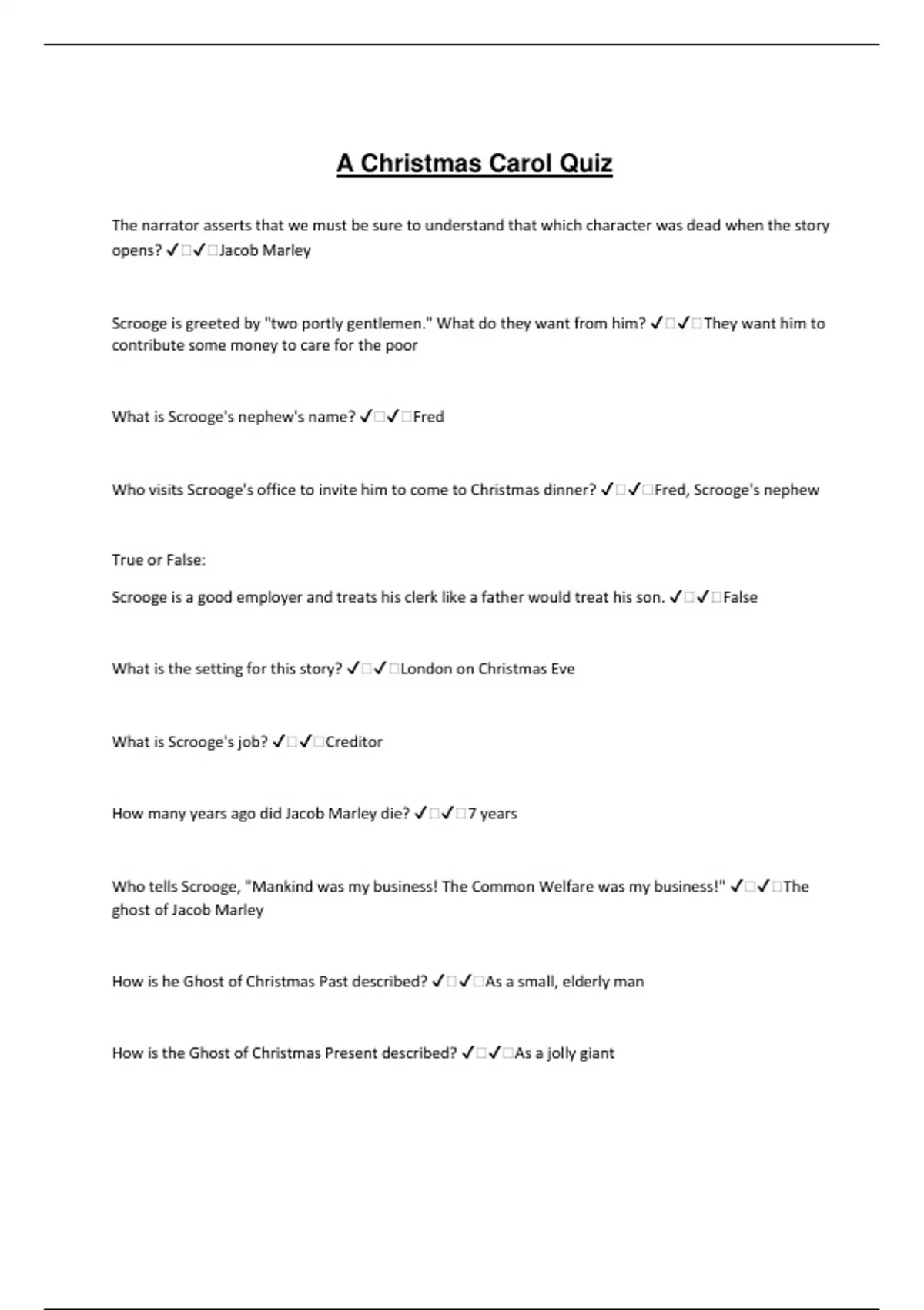 A Christmas Carol Quiz The narrator asserts that we must be sure to understand that which character was dead when the story opens? ️️Jacob Marley Scrooge is greeted by "two portly gentlemen." What do they want from him? ️️They want him to contribute some money to care for the poor What is Scrooge's nephew's name? ️️Fred Who visits Scrooge's office to invite him to come to Christmas dinner? ️️Fred, Scrooge's nephew True or False: Scrooge is a good employer and treats his clerk like a father would treat his son. ️️False What is the setting for this story? ️️London on Christmas Eve What is Scrooge's job? ️️Creditor How many years ago did Jacob Marley die? ️️7 years Who tells Scrooge, "Mankind was my business! The Common Welfare was my business!" ️️The ghost of Jacob Marley How is he Ghost of Christmas Past described? ️️As a small, elderly man How is the Ghost of Christmas Present described? ️️As a jolly giant What is Scrooge's sister's name? ️️Fran Ow is the Ghost of Christmas a Yet To Come described? ️️As a silent phantom What does the ghost of Jacob Marley imply will happen to Scrooge if he does not change? ️️He will have the same fate as him What is Scrooge's ex-fiancé name? ️️Belle Who is Scrooge's clerk? ️️Bob Cracthit Who appears in Scrooge's door-knocker? ️️The Ghost of Jacob Marley Who is Bob Cratchit's crippled son? ️️Tiny Tim Which character utters the famous words, "God bless us, everyone"? ️️Tiny Tim Which ghost is forced to wear heavy chains forged from ledgers and lockboxes as a result of a sinful life? ️️Marley Who brings young Ebeneezer Scrooge home from school? ️️Fan, his sister Where does Martha work? ️️At a milliner's What are the two children called who crawl out from the under the robes of the Ghost of C