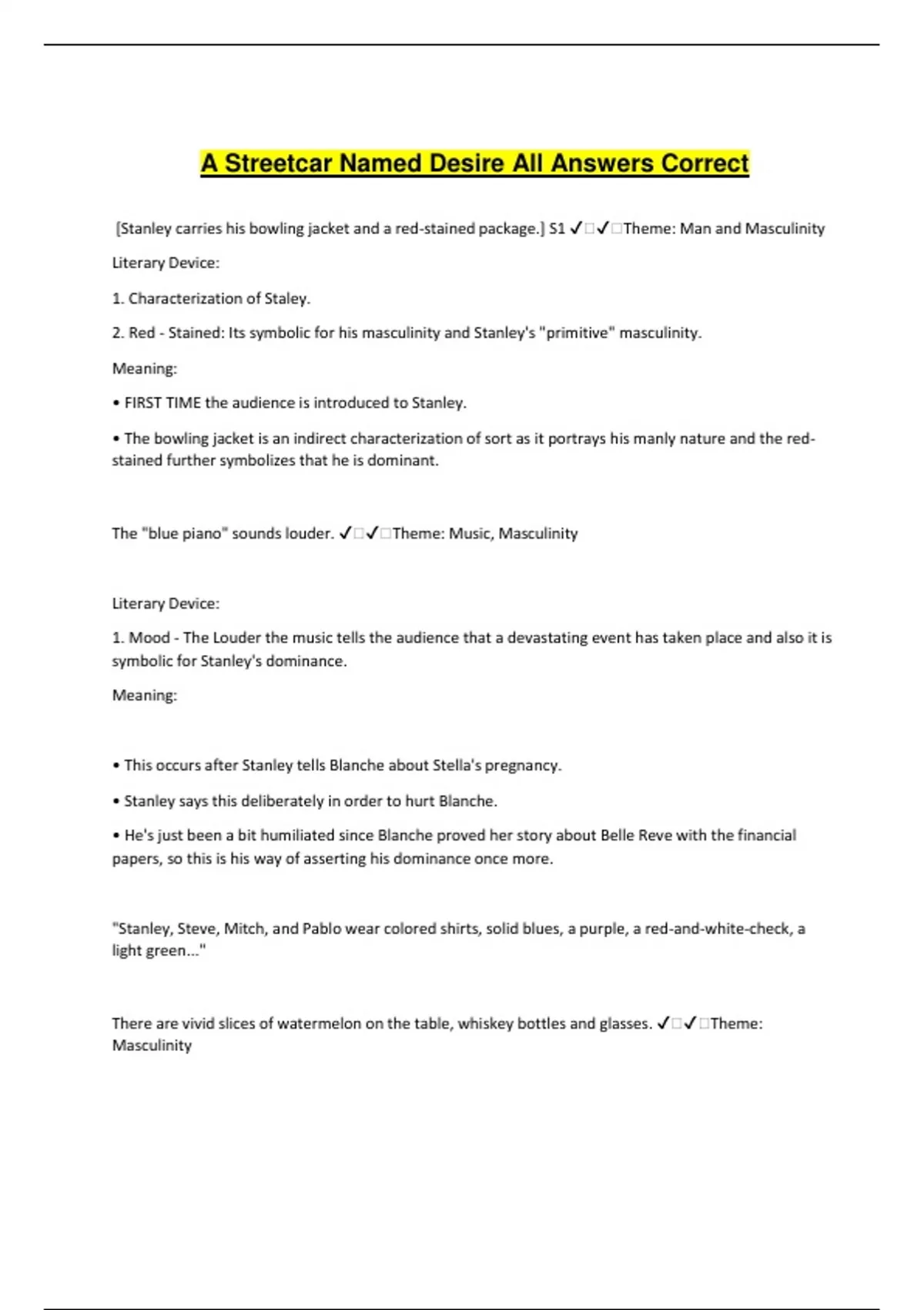 A Streetcar Named Desire All Answers Correct [Stanley carries his bowling jacket and a red-stained package.] S1 ️️Theme: Man and Masculinity Literary Device: 1. Characterization of Staley. 2. Red - Stained: Its symbolic for his masculinity and Stanley's "primitive" masculinity. Meaning: • FIRST TIME the audience is introduced to Stanley. • The bowling jacket is an indirect characterization of sort as it portrays his manly nature and the red stained further symbolizes that he is dominant. The "blue piano" sounds louder. ️️Theme: Music, Masculinity Literary Device: 1. Mood - The Louder the music tells the audience that a devastating event has taken place and also it is symbolic for Stanley's dominance. Meaning: • This occurs after Stanley tells Blanche about Stella's pregnancy. • Stanley says this deliberately in order to hurt Blanche. • He's just been a bit humiliated since Blanche proved her story about Belle Reve with the financial papers, so this is his way of asserting his dominance once more. "Stanley, Steve, Mitch, and Pablo wear colored shirts, solid blues, a purple, a red-and-white-check, a light green..." There are vivid slices of watermelon on the table, whiskey bottles and glasses. ️️Theme: Masculinity Literary Device: 1. Characterization Dramatic Technique: Stage Directions Meaning: • Williams uses physical props - or, in this case, clothing - to make his point about Stanley's masculinity. • These vivid, virile colors contrast with Blanche's white, moth-like clothing + Her name. - The primary colors are the main colors and are symbolic of the men being the main pillars in the society. STELLA: [There is the sound of a blow. Stella cries out.] S3 ️️Theme: Marriage, Men and Masculinity Literary Device: 1. Situational Irony - Stella was the one who was attracted to his animal-like-nature and this is what she gets in return. 2. Foreshadowing Meaning: • It is through this action; the audience understands that Stanley uses violence to assert his dominance over Stella. • This also foreshadows his rape scene later on in the play, as if he has used violence once he is going to use it again. • It also tells that Stanley uses violence to get his own way. STELLA: He was as good as a lamb when I came back...S4 ️️Theme: Sex Literary Device: 1. Simile 2. Metaphor: Lamb 3. Juxtaposition Meaning: 1. Stanley's dual nature makes it difficult for the audience to condemn him. 2. Juxtaposes his nature to that of a sweet lamb. STANLEY: "I want my baby down here. Stella, Stella!" ️️• Blanche is threatening the marriage • Impact on the audience • Very pitiful - A vulnerable position Stanley Stanley: "Hey, canary bird! Toots! ️️• Instigate her sister to advise her to leave. • Not a man's right to threaten a women's livelihood. • Reducing her to an animal • Degradation - reducing her to an animal BLANCHE: only way to live with such a man is to - go to bed with him! (4.90) ️️Theme: Sex Literary Device: 1. Foreshadowing Meaning: • Foreshadowing the rape scene. • At this point she is belittling her sister's choice of man, as she believes he's only good to fulfil Stella's sexual desires, which she backs up to a point saying: things between a man and women must stay in the dark. • Blanche recognizes this and calls it 'brutal desire' suggesting that's all there is to her sister's relationship; which isn't a good basis at all.