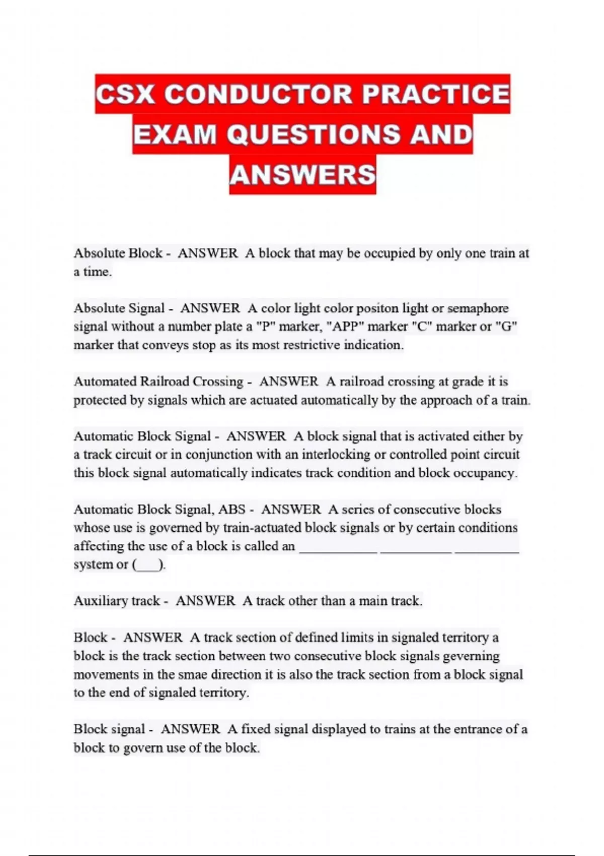 CSX CONDUCTOR PRACTICE EXAM QUESTIONS AND ANSWERS...