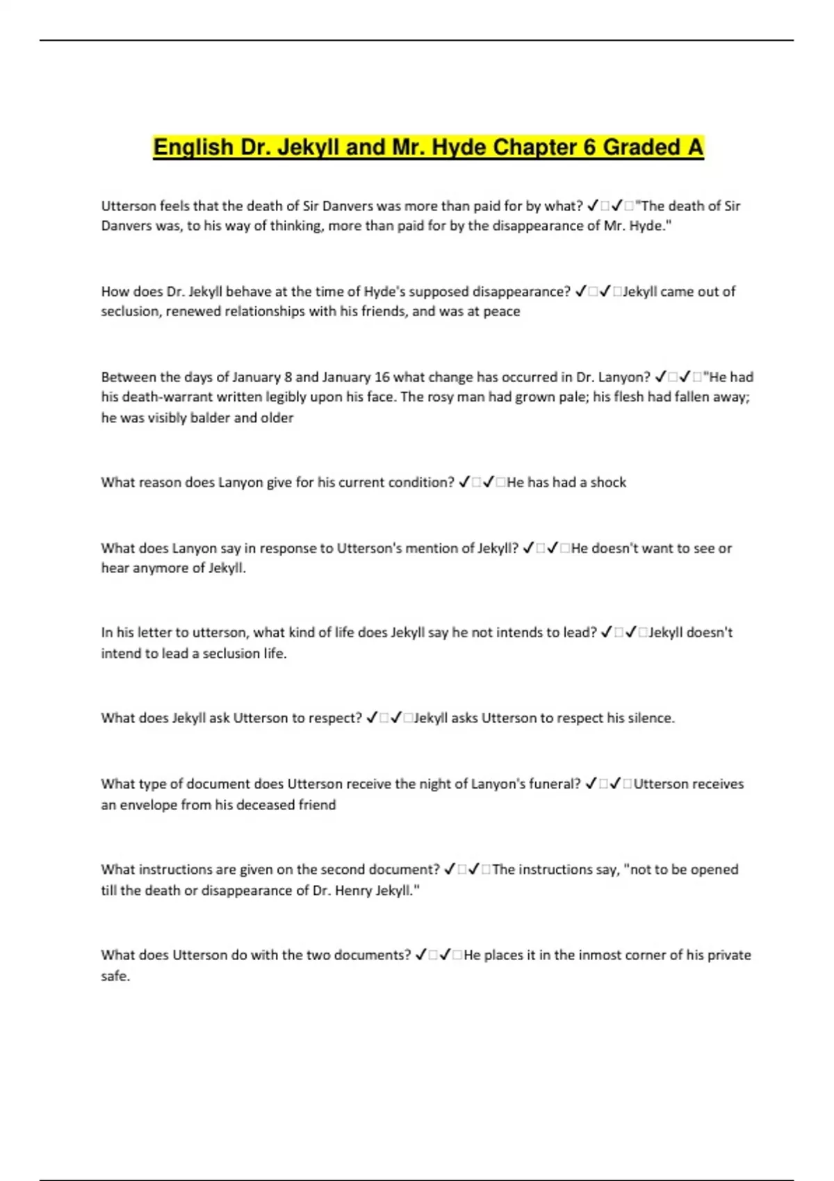 English Dr. Jekyll and Mr. Hyde Chapter 6 Graded A Utterson feels that the death of Sir Danvers was more than paid for by what? ️️"The death of Sir Danvers was, to his way of thinking, more than paid for by the disappearance of Mr. Hyde." How does Dr. Jekyll behave at the time of Hyde's supposed disappearance? ️️Jekyll came out of seclusion, renewed relationships with his friends, and was at peace Between the days of January 8 and January 16 what change has occurred in Dr. Lanyon? ️️"He had his death-warrant written legibly upon his face. The rosy man had grown pale; his flesh had fallen away; he was visibly balder and older What reason does Lanyon give for his current condition? ️️He has had a shock What does Lanyon say in response to Utterson's mention of Jekyll? ️️He doesn't want to see or hear anymore of Jekyll. In his letter to utterson, what kind of life does Jekyll say he not intends to lead? ️️Jekyll doesn't intend to lead a seclusion life. What does Jekyll ask Utterson to respect? ️️Jekyll asks Utterson to respect his silence. What type of document does Utterson receive the night of Lanyon's funeral? ️️Utterson receives an envelope from his deceased friend What instructions are given on the second document? ️️The instructions say, "not to be opened till the death or disappearance of Dr. Henry Jekyll." What does Utterson do with the two documents? ️️He places it in the inmost corner of his private safe.