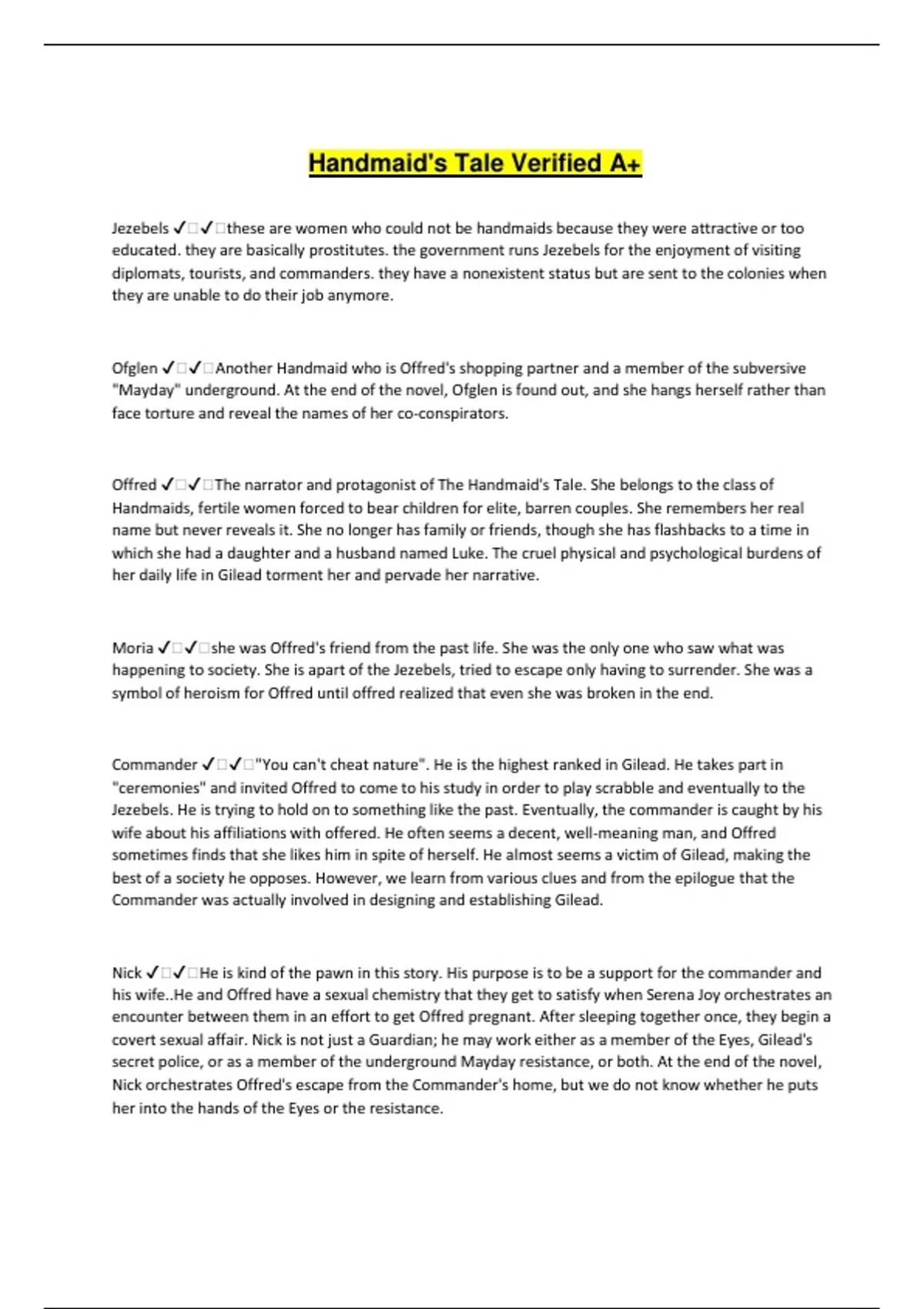 Handmaid's Tale Verified A+ Jezebels ️️these are women who could not be handmaids because they were attractive or too educated. they are basically prostitutes. the government runs Jezebels for the enjoyment of visiting diplomats, tourists, and commanders. they have a nonexistent status but are sent to the colonies when they are unable to do their job anymore. Ofglen ️️Another Handmaid who is Offred's shopping partner and a member of the subversive "Mayday" underground. At the end of the novel, Ofglen is found out, and she hangs herself rather than face torture and reveal the names of her co-conspirators. Offred ️️The narrator and protagonist of The Handmaid's Tale. She belongs to the class of Handmaids, fertile women forced to bear children for elite, barren couples. She remembers her real name but never reveals it. She no longer has family or friends, though she has flashbacks to a time in which she had a daughter and a husband named Luke. The cruel physical and psychological burdens of her daily life in Gilead torment her and pervade her narrative. Moria ️️she was Offred's friend from the past life. She was the only one who saw what was happening to society. She is apart of the Jezebels, tried to escape only having to surrender. She was a symbol of heroism for Offred until offred realized that even she was broken in the end. Commander ️️"You can't cheat nature". He is the highest ranked in Gilead. He takes part in "ceremonies" and invited Offred to come to his study in order to play scrabble and eventually to the Jezebels. He is trying to hold on to something like the past. Eventually, the commander is caught by his wife about his affiliations with offered. He often seems a decent, well-meaning man, and Offred sometimes finds that she likes him in spite of herself. He almost seems a victim of Gilead, making the best of a society he opposes. However, we learn from various clues and from the epilogue that the Commander was actually involved in designing and establishing Gilead. Nick ️️He is kind of the pawn in this story. His purpose is to be a support for the commander and his wife..He and Offred have a sexual chemistry that they get to satisfy when Serena Joy orchestrates an encounter between them in an effort to get Offred pregnant. After sleeping together once, they begin a covert sexual affair. Nick is not just a Guardian; he may work either as a member of the Eyes, Gilead's secret police, or as a member of the underground Mayday resistance, or both. At the end of the novel, Nick orchestrates Offred's escape from the Commander's home, but we do not know whether he puts her into the hands of the Eyes or the resistance. Luke ️️he had an affair with Offred while he was married to another woman, then got a divorce and became Offred's husband. When Gilead comes to power, he attempts to escape to Canada with Offred and their daughter, but they are captured. He is separated from Offred, and the couple never see one another again. Offred typically refers back to luke as a comparison to the love they shared and society now. Janine/ofwarren ️️Offred knows her from their time at the Red Center. She has a baby, which makes her the envy of all the other Handmaids in the area, but the baby later turns out to be deformed—an "Unbaby"—and there are rumors that her doctor fathered the child. she is a conformist, always ready to go along with what Gilead demands of her, and so she endears herself to the Aunts and to all authority figures. Offred holds Janine in contempt for taking the easy way out. Aunt Lydia ️️The Aunts are the class of women assigned to indoctrinate the Handmaids with the beliefs of the new society and make them accept their fates. Aunt Lydia works at the "Red Center," the re‑education center where Offred and other women go for instruction before becoming Handmaids. Although she appears only in Offred's flashbacks, Aunt Lydia and her instructions haunt Offred in her daily life. Aunt Lydia's slogans and maxims drum the ideology of the new society into heads of the women, until even those like Offred, women who do not truly believe in the ideology, hear Gilead's words echoing in their heads. Serena Joy ️️The Commander's Wife, Serena worked in pre-Gilead days as a gospel singer, then as an anti-feminist activist and crusader for "traditional values." In Gilead, she sits at the top of the female social ladder, yet she is desperately unhappy. Serena's unhappiness shows that her restrictive, male dominated society cannot bring happiness even to its most pampered and powerful women. Serena jealously guards her claims to status and behaves cruelly toward the Handmaids in her household. Cora ️️Cora works as a servant in the Commander's household. She belongs to the class of Marthas, infertile women who do not qualify for the high status of Wives and so work in domestic roles. Cora seems more content with her role than her fellow Martha, Rita. She hopes that Offred will be able to conceive, because then she will have a hand in raising a child.