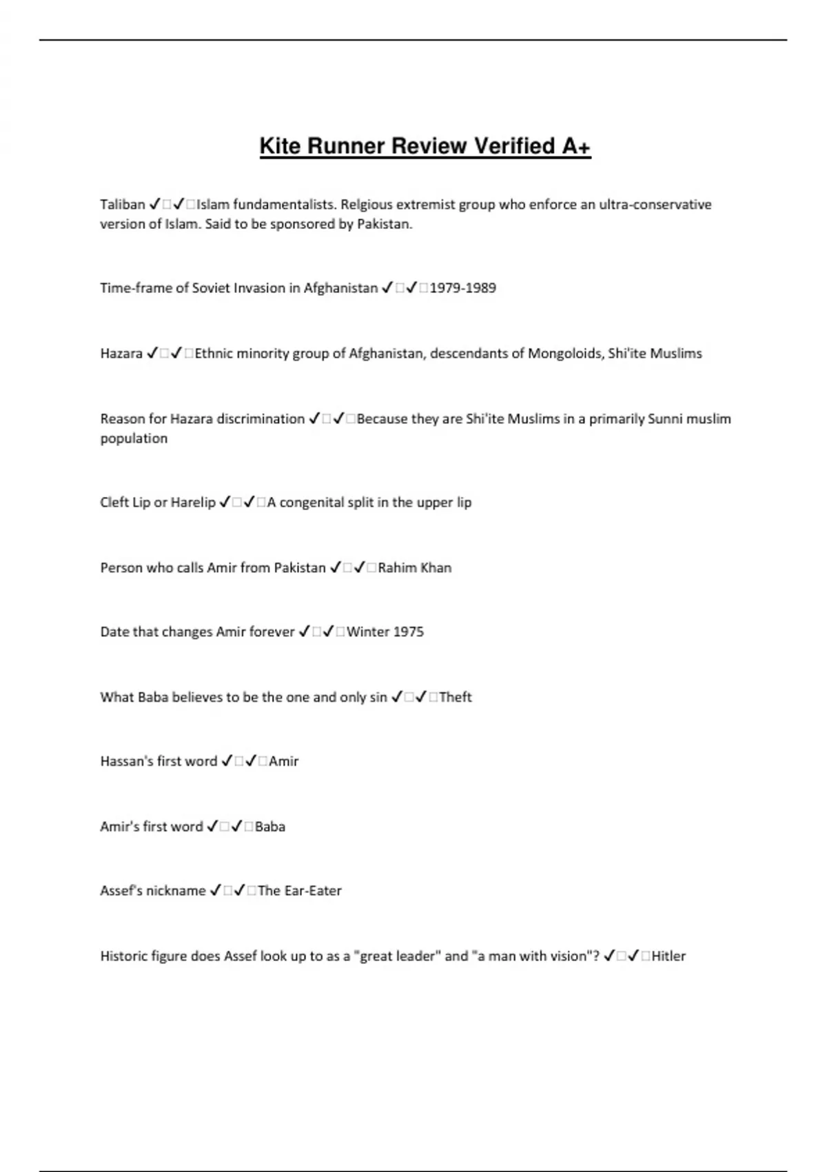 Kite Runner Review Verified A+ Taliban ️️Islam fundamentalists. Relgious extremist group who enforce an ultra-conservative version of Islam. Said to be sponsored by Pakistan. Time-frame of Soviet Invasion in Afghanistan ️️ Hazara ️️Ethnic minority group of Afghanistan, descendants of Mongoloids, Shi'ite Muslims Reason for Hazara discrimination ️️Because they are Shi'ite Muslims in a primarily Sunni muslim population Cleft Lip or Harelip ️️A congenital split in the upper lip Person who calls Amir from Pakistan ️️Rahim Khan Date that changes Amir forever ️️Winter 1975 What Baba believes to be the one and only sin ️️Theft Hassan's first word ️️Amir Amir's first word ️️Baba Assef's nickname ️️The Ear-Eater Historic figure does Assef look up to as a "great leader" and "a man with vision"? ️️Hitler Baba's gift to Hassan on his Birthday ️️Plastic surgery to correct his cleft lip Blonde, blue-eyed bully who hassles Amir and Hassan ️️Assef Popular activity in Afghan winters ️️Kite Flying Wrong that happens to Hassan in the alley after the Kite Flying tournament ️️He is raped by Assef Amir's reaction to what he sees in the Alley ️️To run away and pretend he did not see it What Amir plants under Hassan's mattress ️️Money and his birthday watch Character whose actions exemplify betrayal ️️Amir Character whose actions exemplify loyalty ️️Hassan Character who stands up to Russian soldier who wants 30 min with the woman in the truck. Theme that is exemplified. ️️Baba. Strength of Character City Baba and Amir emigrate to in the United States ️️Fremont, California Name of Amir's Swap Meet Princess? ️️Soraya "America acts as a place for ________ to bury his memories, and a place for _______ to mourn his" ️️Amir, Baba Amir places money under a mattress for a second time in the novel. This theme is exemplified. ️️Redemption Character who is referenced as having "the look of the lamb" ️️Hassan's face during the rape The fruit Amir provokes Hassan with ️️Pomegranate Character who is an example of poetic justice ️️Kamal Ethnic group which Hassan belongs to. Ethnic group which Amir belongs to. ️️Hazara, Pashtun Character who is characterized as a bear. ️️Baba Character who suffers from Polio ️️Ali Symbolism of Kite Flying in The Kite Runner ️️-Symbolizes unity of Afghans, and Amir and Hassan's friendship (among other things) Symbol of the novel ️️Pomegranate tree, the slingshot, The Blue Kite, Kite Flying, the Lamb, etc Baba's last fatherly duty ️️To ask General Tahib for his daughter's hand in marraige for Amir. Reason for Soraya to be a topic of gossip ️️Because she ran away and lived with a man who did drugs Cause of Baba's death ️️Cancer Reason trees are cut down in Kabul ️️For firewood and because snipers would hide in them The Beard Patrol ️️The Taliban Origin of Sohrab's name ️️The Myth of Sohrab and Rostam Phrase carved into pomegranate tree ️️Amir and Hassan: Sulta