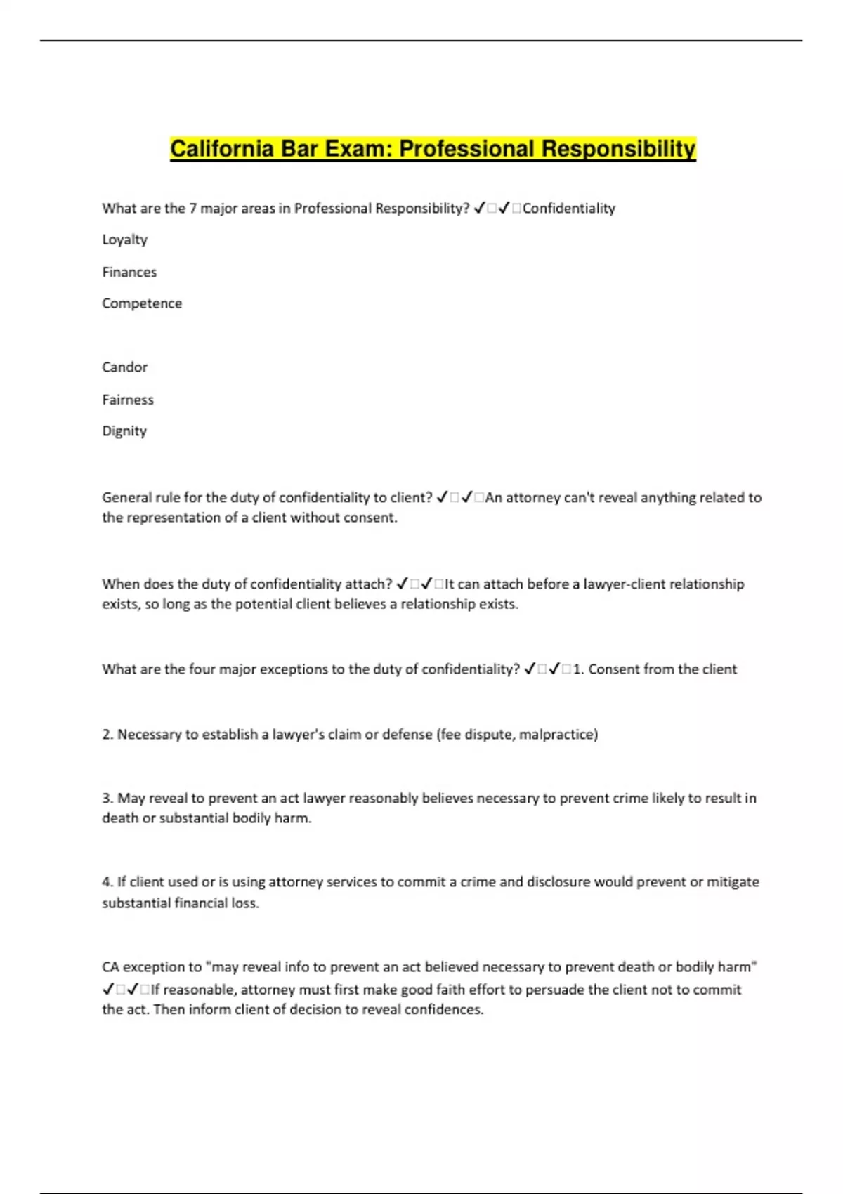 California Bar Exam: Professional Responsibility What are the 7 major areas in Professional Responsibility? ️️Confidentiality Loyalty Finances Competence Candor Fairness Dignity General rule for the duty of confidentiality to client? ️️An attorney can't reveal anything related to the representation of a client without consent. When does the duty of confidentiality attach? ️️It can attach before a lawyer-client relationship exists, so long as the potential client believes a relationship exists. What are the four major exceptions to the duty of confidentiality? ️️1. Consent from the client 2. Necessary to establish a lawyer's claim or defense (fee dispute, malpractice) 3. May reveal to prevent an act lawyer reasonably believes necessary to prevent crime likely to result in death or substantial bodily harm. 4. If client used or is using attorney services to commit a crime and disclosure would prevent or mitigate substantial financial loss. CA exception to "may reveal info to prevent an act believed necessary to prevent death or bodily harm" ️️If reasonable, attorney must first make good faith effort to persuade the client not to commit the act. Then inform client of decision to reveal confidences. CA exception to "prevent substantial financial loss" ️️NONE!!!! Distinguish Confidentiality from Attorney-Client privilege ️️Attorney client is included in the broader category of the duty of confidentiality. This allows the attorney to refuse to produce evidence or testify about confidential communications related to the representation from client or agents to the attorney. General rule of Duty of Loyalty ️️Covers conflict of interest. If an interest of the attorney, another client, or a third party materially limits or is adverse to loyal representation, the attorney has a conflict of interest. Potential v. Actual Conflict ️️A potential conflict is one that has the possibility of occurring in the future. An actual conflict is one that actual is occurring at time of representation. What is an imputed disqualification? ️️The attorney and all members of the attorney's firm share each other conflicts. If there is a conflict, what rule applies? ️️The attorney must not take on representation unless: 1. Attorney objectively and reasonably believe he can represent everyone effectively despite potential and actual conflict; AND 2. Inform each affected client (which could raise confidentiality issues; AND 3. Client consents, confirmed in writing When can an attorney enter into a business transaction with a client, or a business transaction adverse to the client? ️️1. Terms must be fair 2. Client is fully disclosed in writing 3. Client has the opportunity to consult outside lawyer 4. Client consents in writing Can a lawyer limit his liability to a client for malpractice? ️️1. Cant restrict the client from reporting the attorney for ethical or professional violations. 3. Cant limit malpractice unless client has independent representation in making agreement. Publication Rights of clients ish? ️️ABA: cant obtain rights until after representation CA: Allows obtaining rights if a judge is satisfied that client clearly understands and consents. Can you give your client a loan? ️️ABA: No financial assistance except for costs of litigation expenses representing an indigent, and advance of litigation expenses in contingent fee cases. CA: Cant promise to pay prospective clients debts as a way to get hired. Can loan money in all matters after lawyer is hired if there is a written agreement to pay back debt. Gifts ️️Must not solicit substantial gifts Close relationship with opposing counsel ️️Attorney can't oppose a party represented by a relative without informed client consent What happens if attorney is representing clients with opposin