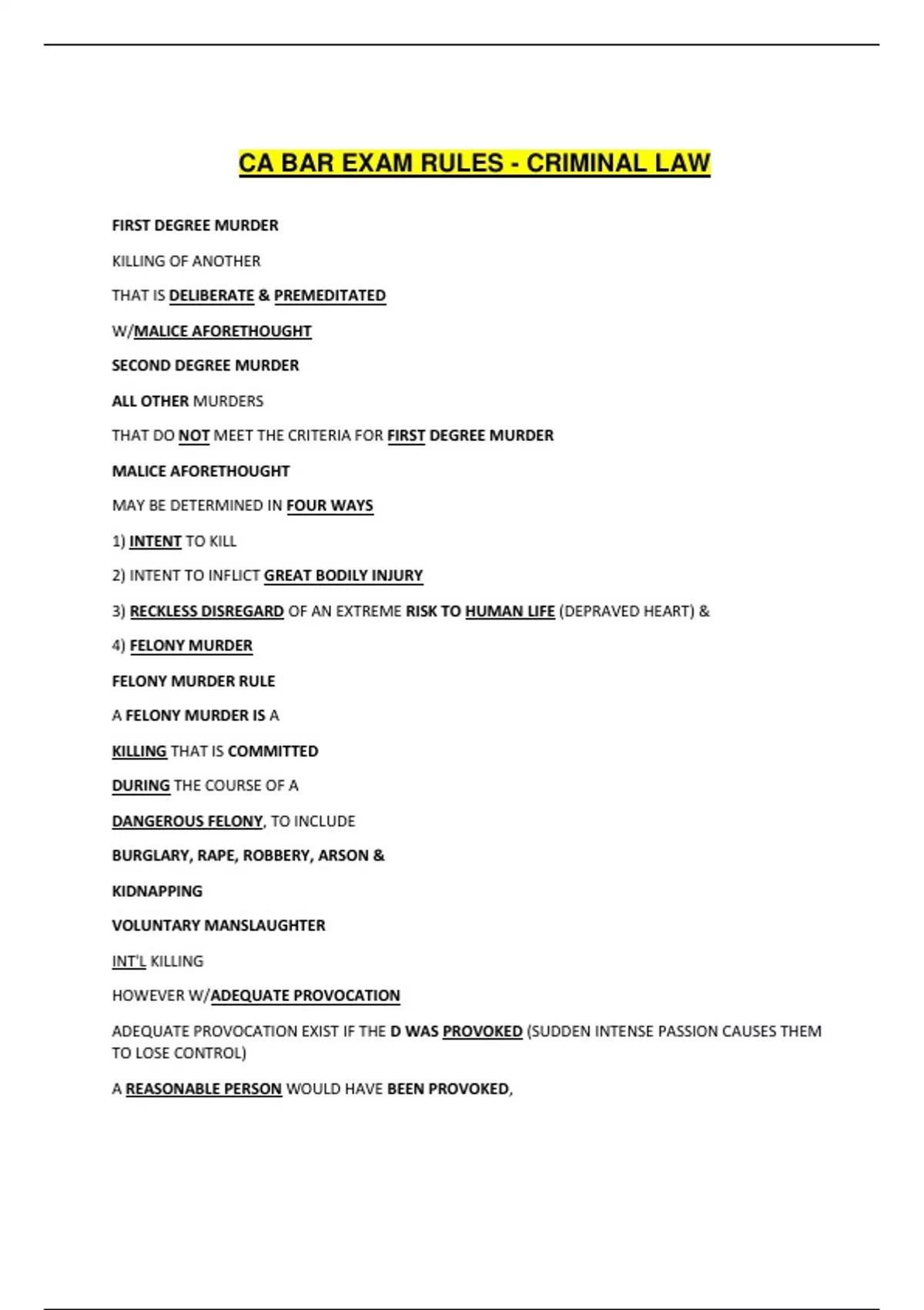 CA BAR EXAM RULES - CRIMINAL LAW FIRST DEGREE MURDER KILLING OF ANOTHER THAT IS DELIBERATE & PREMEDITATED W/MALICE AFORETHOUGHT SECOND DEGREE MURDER ALL OTHER MURDERS THAT DO NOT MEET THE CRITERIA FOR FIRST DEGREE MURDER MALICE AFORETHOUGHT MAY BE DETERMINED IN FOUR WAYS 1) INTENT TO KILL 2) INTENT TO INFLICT GREAT BODILY INJURY 3) RECKLESS DISREGARD OF AN EXTREME RISK TO HUMAN LIFE (DEPRAVED HEART) & 4) FELONY MURDER FELONY MURDER RULE A FELONY MURDER IS A KILLING THAT IS COMMITTED DURING THE COURSE OF A DANGEROUS FELONY, TO INCLUDE BURGLARY, RAPE, ROBBERY, ARSON & KIDNAPPING VOLUNTARY MANSLAUGHTER INT'L KILLING HOWEVER W/ADEQUATE PROVOCATION ADEQUATE PROVOCATION EXIST IF THE D WAS PROVOKED (SUDDEN INTENSE PASSION CAUSES THEM TO LOSE CONTROL) A REASONABLE PERSON WOULD HAVE BEEN PROVOKED, THERE WAS NOT ENOUGH TIME TO COOL OFF & THE D DID NOT COOL OFF INSANITY DEFENSES A DEFENSE OF INSANITY FOR A SEVERE MENTAL DEFECT OR DISEASE WILL BE ANALYZED BY ONE OF FOUR TESTS: 1) M'NAGHTEN TEST A MENTAL DISEASE EXIST WHERE THE D IS A) UNABLE TO KNOW THE PHYS NATURE OR QUALITY OF THEIR ACTS OR B) UNABLE TO UNDERSTAND THEIR ACT WAS MORALLY WRONG 2) MODERN PENAL CODE MENTAL DISEASE WHERE THE D IS A) UNABLE TO APPRECIATE THE CRIMINALITY OF CONDUCT OR B) UNABLE TO CONFORM HIS ACTIONS TO LAW. 3) IRRESISTIBLE IMPULSE TEST D'S IS NOT GUILTY WHERE A MENTAL DEFECT KEPT HIM FROM CONTROLLING HIS CONDUCT 4) DURHAM TEST UNLAWFUL CONDUCT WAS THE PRODUCT OF MENTAL ILLNESS SOLICITATION SOLICITATION CONSISTS OF ENTICING, COUNSELING, ADVISING, INDUCING, URGING, OR COMMANDING ANOTHER TO COMMIT A CRIME W/THE SPECIFIC INTENT THAT THE PERSON SOLICITED COMMIT THE CRIME. THE OFFENSE IS COMP AT THE TIME THE SOLICITATION IS MADE. IT IS NOT NECESSARY THAT THE PERSON SOLICITED AGREE TO COMMIT THE CRIME OR DO ANYTHING IN RESPONSE ATTEMPT A PERSON HAD THE SPECIFIC INTENT TO COMMIT A CRIME & TOOK A SUBSTANTIAL STEP SUFFICIENTLY BEYOND MERE PREPARATION, HOWEVER, FAILS TO COMP THE CRIM. MPC REQUIRES A "SUBSTANTIAL STEP" MERGES W/THE UNDERLYING CRIME SEARCH AND SEIZURE UNDER THE 4A APPLICABLE TO THE STATES VIA THE 14A, GOVT ACTION SHALL NOT VIOLATE PEOPLE'S RIGHT TO BE SECURE AGAINST UNREASONABLE SEARCHES & SEIZURES. ACTS BY PRIVATE INDIVIDUALS ARE NOT PROTECTED BY THE 4A. 4A STANDING A PERSON HAS A REASONABLE EXPECTATION TO PRIVACY WHERE THERE IS A PHYSICAL INTRUSION BY THE GOVT INTO A CONSTITUTIONALY PROTECTED AREA TO OBTAIN INFORMATION. THERE IS NO REASONABLE EXPECTATION TO PRIVACY TO THINGS HELD OUT TO THE PUBLIC, SUCH AS CONVERSATIONS. SEIZURE UNDER THE 4A, A PER IS GRANTED PROTECTION UNLAWFUL GOVT SEARCHES & SEIZURES A SEIZURE IS WHEN A REASONABLE PER BELIEVES THEY'RE NOT FREE TO LEAVE AUTO CHECK POINTS POLICE MAY SET UP ROAD BLOCKS TO STOP CARS W/O REASONABLE SUSPICION WHEN: 1) STOPS ARE MADE BASED ON A NEUTRAL, ARTICULABLE STANDAR