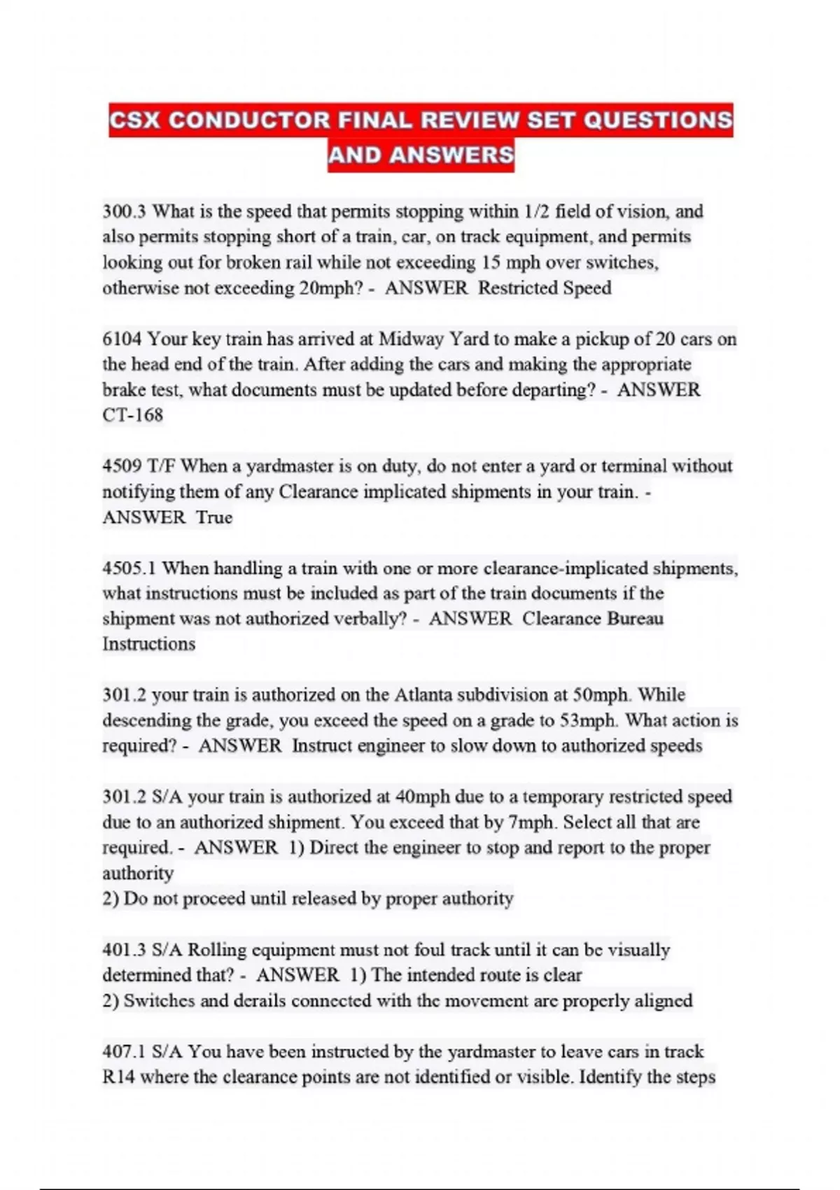 CSX CONDUCTOR FINAL REVIEW SET QUESTIONS AND ANSWERS....