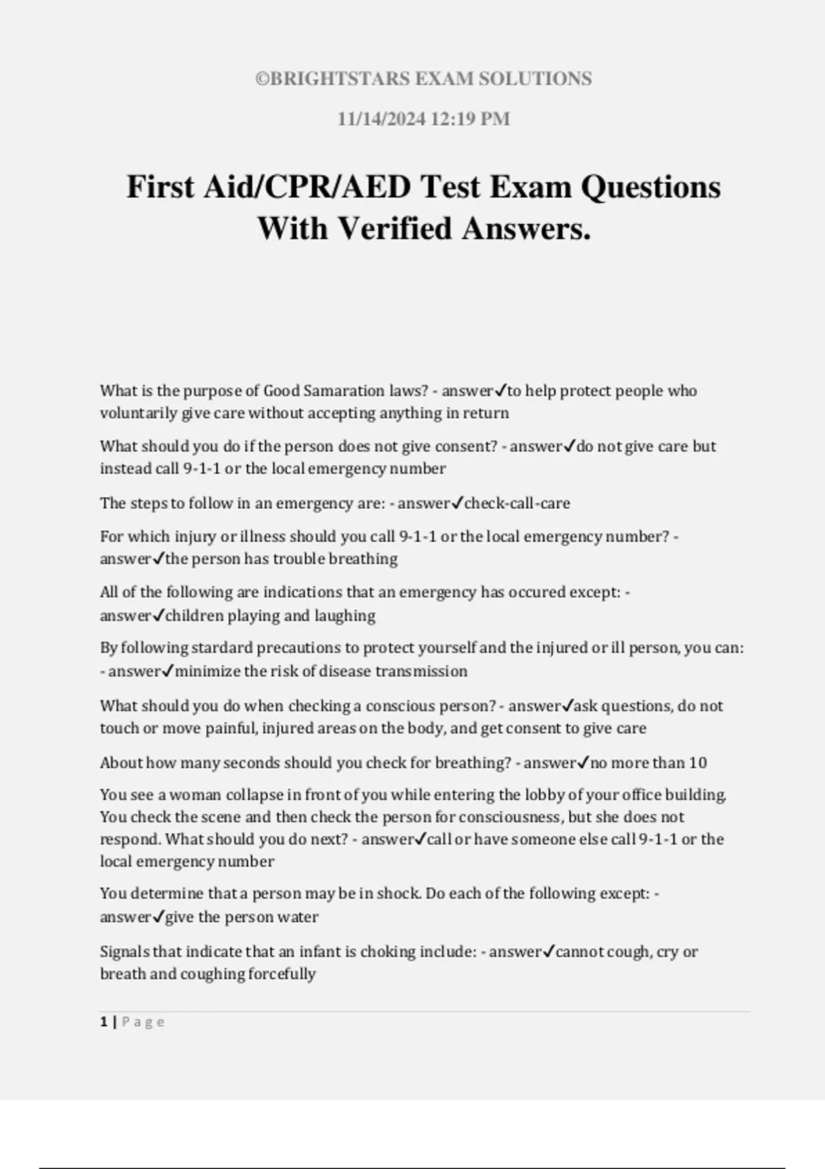 ©BRIGHTSTARS EXAM SOLUTIONS 11/14/2024 12:19 PM 1 | P a g e First Aid/CPR/AED Test Exam Questions With Verified Answers. What is the purpose of Good Samaration laws? - answerto help protect people who voluntarily give care without accepting anything in return What should you do if the person does not give consent? - answerdo not give care but instead call 9-1-1 or the local emergency number The steps to follow in an emergency are: - answercheck-call-care For which injury or illness should you call 9-1-1 or the local emergency number? - answerthe person has trouble breathing All of the following are indications that an emergency has occured except: - answerchildren playing and laughing By following stardard precautions to protect yourself and the injured or ill person, you can: - answerminimize the risk of disease transmission What should you do when checking a conscious person? - answerask questions, do not touch or move painful, injured areas on the body, and get consent to give care About how many seconds should you check for breathing? - answerno more than 10 You see a woman collapse in front of you while entering the lobby of your office building. You check the scene and then check the person for consciousness, but she does not respond. What should you do next? - answercall or have someone else call 9-1-1 or the local emergency number You determine that a person may be in shock. Do each of the following except: - answergive the person water Signals that indicate that an infant is choking include: - answercannot cough, cry or breath and coughing forcefully