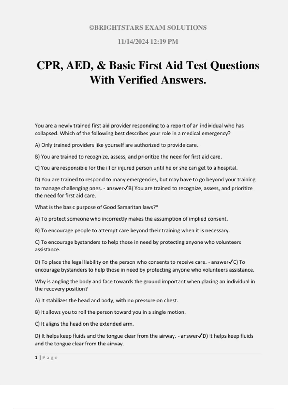 ©BRIGHTSTARS EXAM SOLUTIONS 11/14/2024 12:19 PM 1 | P a g e CPR, AED, & Basic First Aid Test Questions With Verified Answers. You are a newly trained first aid provider responding to a report of an individual who has collapsed. Which of the following best describes your role in a medical emergency? A) Only trained providers like yourself are authorized to provide care. B) You are trained to recognize, assess, and prioritize the need for first aid care. C) You are responsible for the ill or injured person until he or she can get to a hospital. D) You are trained to respond to many emergencies, but may have to go beyond your training to manage challenging ones. - answerB) You are trained to recognize, assess, and prioritize the need for first aid care. What is the basic purpose of Good Samaritan laws?* A) To protect someone who incorrectly makes the assumption of implied consent. B) To encourage people to attempt care beyond their training when it is necessary. C) To encourage bystanders to help those in need by protecting anyone who volunteers assistance. D) To place the legal liability on the person who consents to receive care. - answerC) To encourage bystanders to help those in need by protecting anyone who volunteers assistance. Why is angling the body and face towards the ground important when placing an individual in the recovery position? A) It stabilizes the head and body, with no pressure on chest. B) It allows you to roll the person toward you in a single motion. C) It aligns the head on the extended arm. D) It helps keep fluids and the tongue clear from the airway. - answerD) It helps keep fluids and the tongue clear from the airway. ©BRIGHT