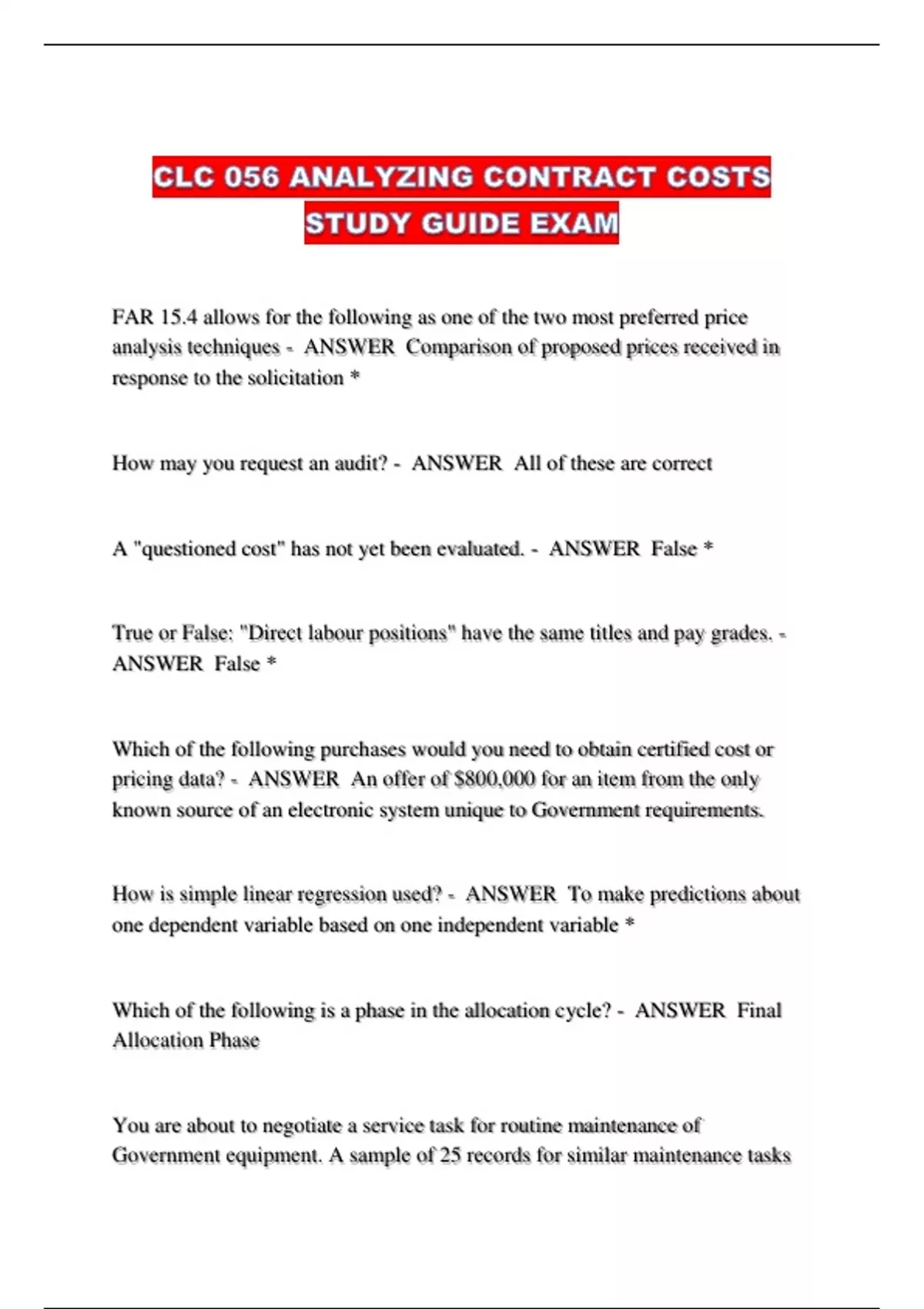 CLC 056 ANALYZING CONTRACT COSTS STUDY GUIDE EXAM....