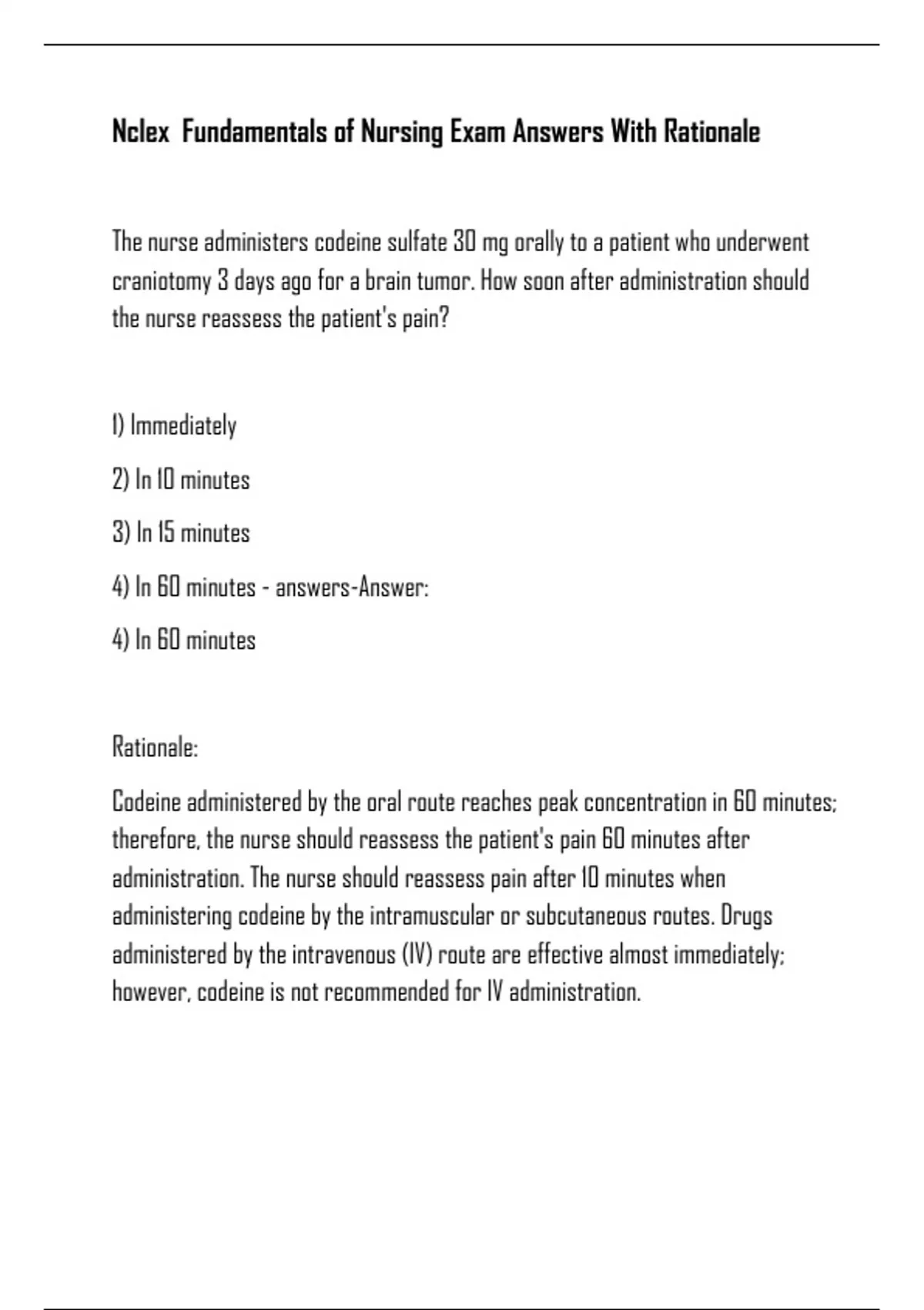 Nclex Fundamentals of Nursing Exam Answers With Rationale The nurse administers codeine sulfate 30 mg orally to a patient who underwent craniotomy 3 days ago for a brain tumor. How soon after administration should the nurse reassess the patient's pain? 1) Immediately 2) In 10 minutes 3) In 15 minutes 4) In 60 minutes - answers-Answer: 4) In 60 minutes Rationale: Codeine administered by the oral route reaches peak concentration in 60 minutes; therefore, the nurse should reassess the patient's pain 60 minutes after administration. The nurse should reassess pain after 10 minutes when administering codeine by the intramuscular or subcutaneous routes. Drugs administered by the intravenous (IV) route are effective almost immediately; however, codeine is not recommended for IV administration. Which nonsteroidal anti-inflammatory drug might be administered to inhibit platelet aggregation in a patient at risk for thrombophlebitis? 1) Ibuprofen (Motrin) 2) Celecoxib (Celebrex) 3) Aspirin (Ecotrin) 4) Indomethacin (Indocin) - answers-Answer: 3) Aspirin (Ecotrin) Rationale: Aspirin is a unique NSAID that inhibits platelet aggregation. Low-dose aspirin therapy is commonly administered to decrease the risk of thrombophlebitis, myocardial infarction, and stroke. Ibuprofen, celecoxib, and indomethacin are NSAIDs, but they do not inhibit platelet aggregation. A client who is receiving epidural analgesia complains of nausea and loss of motor function in his legs. The nurse obtains his blood pressure and notes a drop in his blood pressure from the previous reading. Which complication is the patient most likely experiencing? 1) Infection at the catheter insertion site 2) Side effect of the epidural analgesic 3) Epidural catheter migration 4) Spinal cord damage - answers-Answer: 3) Epidural catheter migration