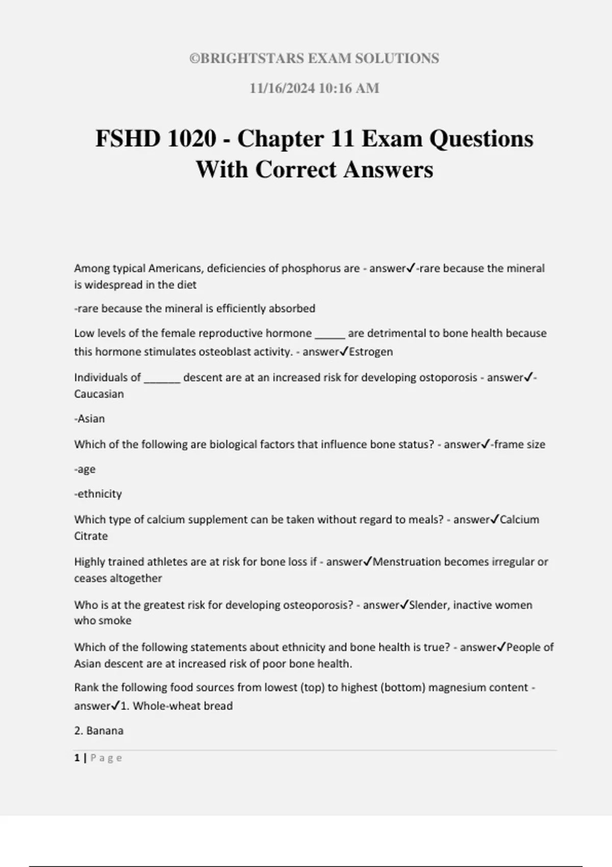 ©BRIGHTSTARS EXAM SOLUTIONS 11/16/2024 10:16 AM 1 | P a g e FSHD 1020 - Chapter 11 Exam Questions With Correct Answers Among typical Americans, deficiencies of phosphorus are - answer-rare because the mineral is widespread in the diet -rare because the mineral is efficiently absorbed Low levels of the female reproductive hormone _____ are detrimental to bone health because this hormone stimulates osteoblast activity. - answerEstrogen Individuals of ______ descent are at an increased risk for developing ostoporosis - answer- Caucasian -Asian Which of the following are biological factors that influence bone status? - answer-frame size -age -ethnicity Which type of calcium supplement can be taken without regard to meals? - answerCalcium Citrate Highly trained athletes are at risk for bone loss if - answerMenstruation becomes irregular or ceases altogether Who is at the greatest risk for developing osteoporosis? - answerSlender, inactive women who smoke Which of the following statements about ethnicity and bone health is true? - answerPeople of Asian descent are at increased risk of poor bone health. Rank the following food sources from lowest (top) to highest (bottom) magnesium content - answer1. Whole-wheat bread 2. Banana