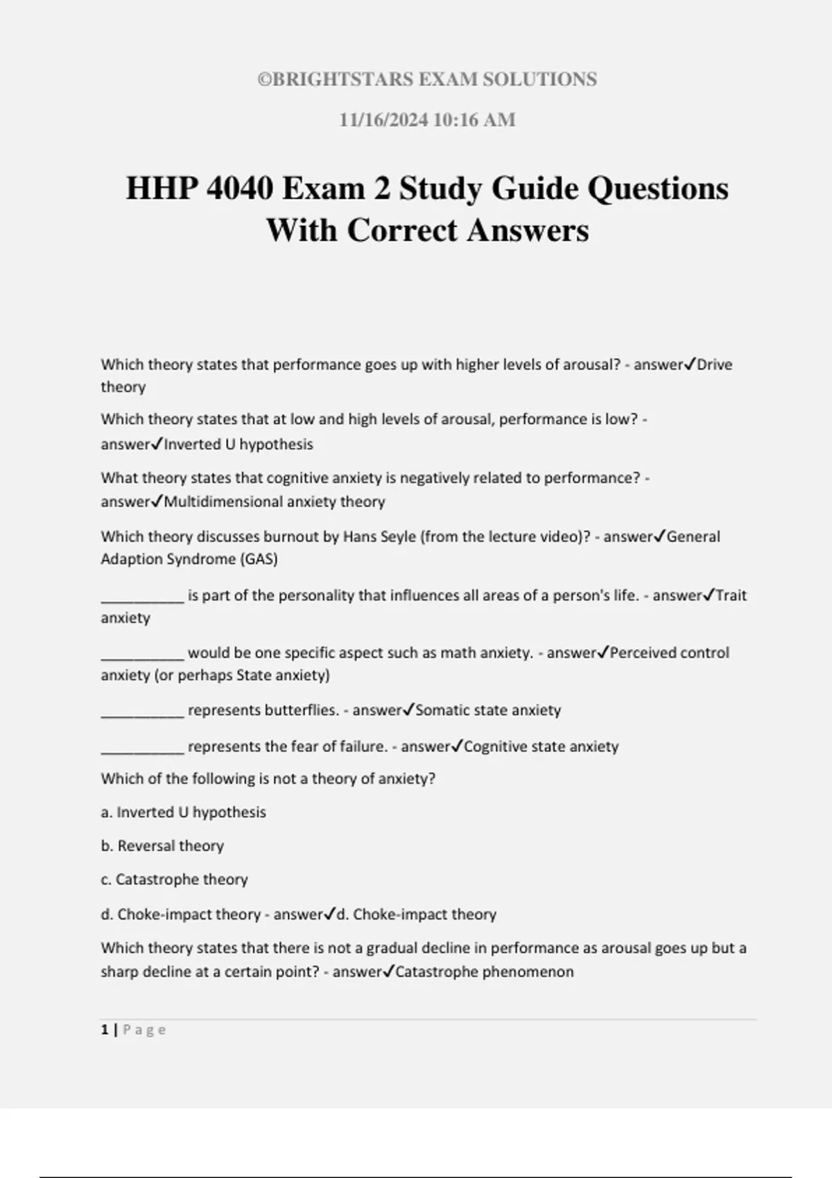 ©BRIGHTSTARS EXAM SOLUTIONS 11/16/2024 10:16 AM 1 | P a g e HHP 4040 Exam 2 Study Guide Questions With Correct Answers Which theory states that performance goes up with higher levels of arousal? - answerDrive theory Which theory states that at low and high levels of arousal, performance is low? - answerInverted U hypothesis What theory states that cognitive anxiety is negatively related to performance? - answerMultidimensional anxiety theory Which theory discusses burnout by Hans Seyle (from the lecture video)? - answerGeneral Adaption Syndrome (GAS) __________ is part of the personality that influences all areas of a person's life. - answerTrait anxiety __________ would be one specific aspect such as math anxiety. - answerPerceived control anxiety (or perhaps State anxiety) __________ represents butterflies. - answerSomatic state anxiety __________ represents the fear of failure. - answerCognitive state anxiety Which of the following is not a theory of anxiety? a. Inverted U hypothesis b. Reversal theory c. Catastrophe theory d. Choke-impact theory - answerd. Choke-impact theory Which theory states that there is not a gradual decline in performance as arousal goes up but a sharp decline at a certain point? - answerCatastrophe phenomenon ©BRIGHTSTARS EXAM SOLUTIONS 11/16/2024 10:16 AM 2 | P a g e Which theory states that cognitive anxiety and somatic anxiety follow different formations as it relates to performance? - answerMultidimensional anxiety theory __________ is a drill about using failure as a positive experience? - answerFail Forward One way to turn pressure into pleasure, you should see pressure as an ___________. - answerSeeing pressure as a badge of honor; you earned it Fly in the NO complaint Zone was about which famous baseball player? a. Joe Dimaggio b. Babe Ruth c. Jackie Robinson d. Mickey Mantle - answerJackie Robinson In Sing the Carly Principle, Carly Simon had a __________? a. Stuttering b. Nervous twitch c. Nervous stomach d. Problem with her vision - answerStutter What did the famous Boston Celtic Bill Russell do before almost every game? a. Pray b. Eat chicken c. Throw up d. Pet his lucky rabbit's foot - answerThrow up The "Zen coach" of basketball is who? - answerPhil Jackson In the drill when you eat a starburst candy, it was so that you __________ the moment. a. relish b. savor c. be d. enjoy - answerb. savor