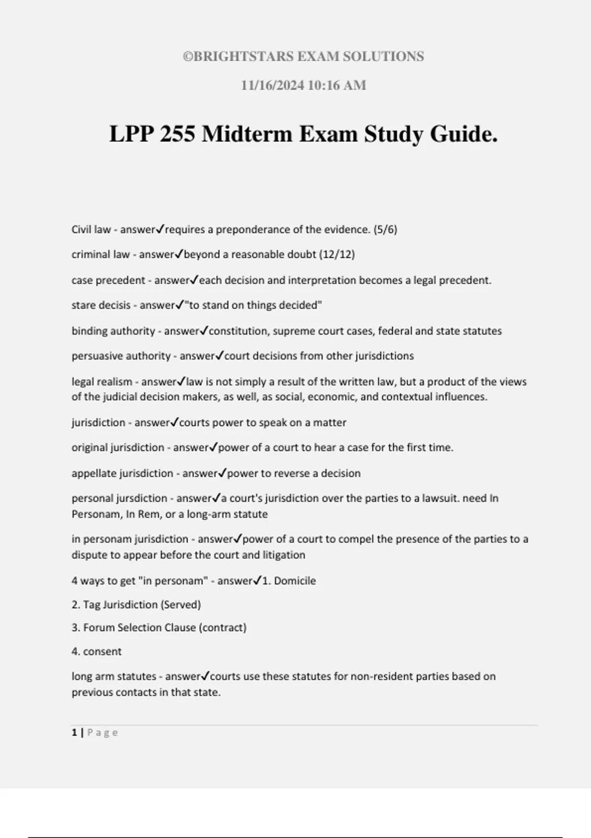©BRIGHTSTARS EXAM SOLUTIONS 11/16/2024 10:16 AM 1 | P a g e LPP 255 Midterm Exam Study Guide. Civil law - answerrequires a preponderance of the evidence. (5/6) criminal law - answerbeyond a reasonable doubt (12/12) case precedent - answereach decision and interpretation becomes a legal precedent. stare decisis - answer"to stand on things decided" binding authority - answerconstitution, supreme court cases, federal and state statutes persuasive authority - answercourt decisions from other jurisdictions legal realism - answerlaw is not simply a result of the written law, but a product of the views of the judicial decision makers, as well, as social, economic, and contextual influences. jurisdiction - answercourts power to speak on a matter original jurisdiction - answerpower of a court to hear a case for the first time. appellate jurisdiction - answerpower to reverse a decision personal jursdiction - answera court's jurisdiction over the parties to a lawsuit. need In Personam, In Rem, or a long-arm statute in personam jurisdiction - answerpower of a court to compel the presence of the parties to a dispute to appear before the court and litigation 4 ways to get "in personam" - answer1. Domicile 2. Tag Jurisdiction (Served) 3. Forum Selection Clause (contract) 4. consent long arm statutes - answercourts use these statutes for non-resident parties based on previous contacts in that state.