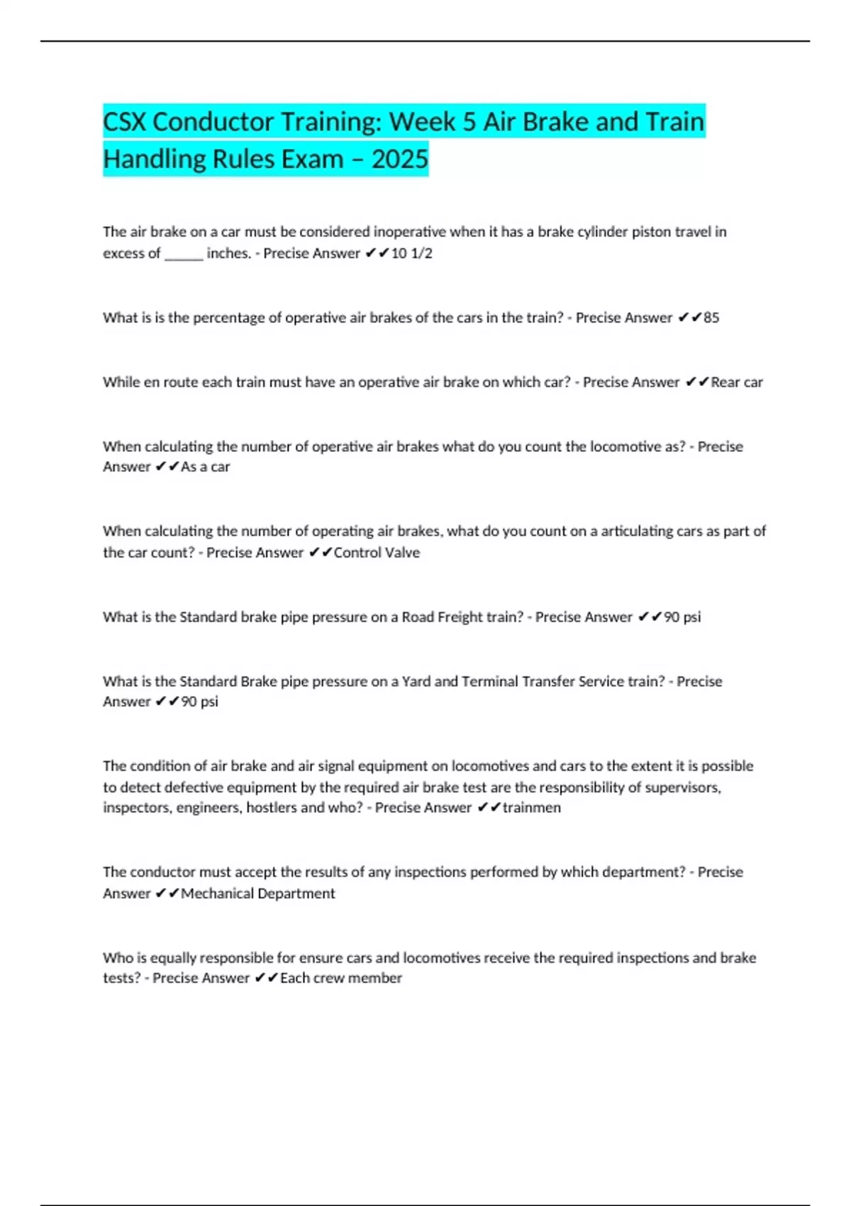 CSX Conductor Training: Week 5 Air Brake and Train Handling Rules Exam – 2025
