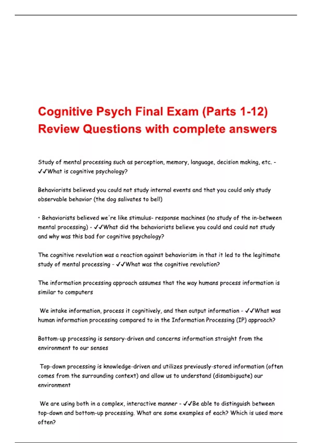 Cognitive Psych Final Exam (Parts 1-12) Review Questions with complete answers.
