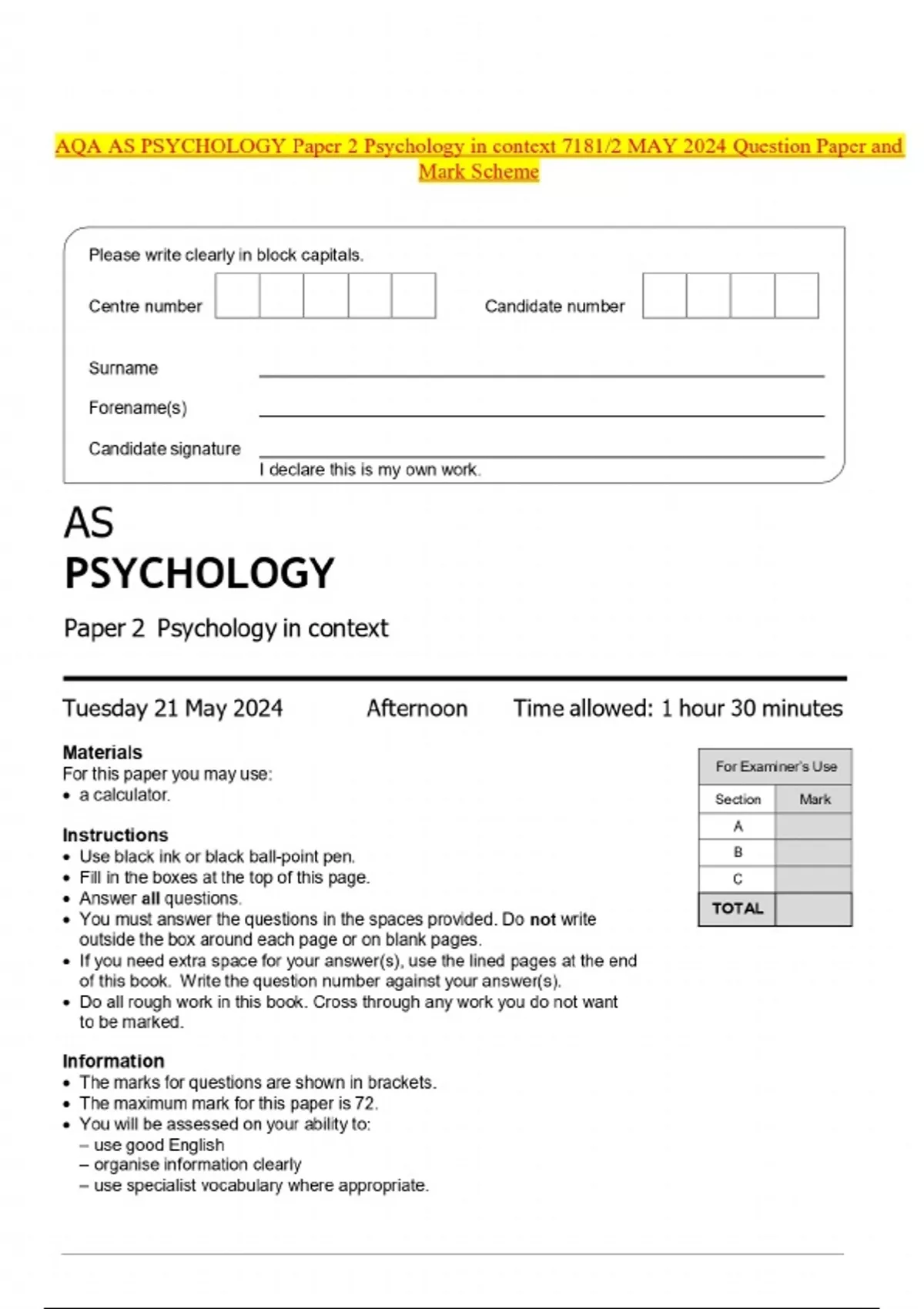 AQA AS PSYCHOLOGY Paper 2 Psychology in context 7181/2 MAY 2024 Question Paper and Mark Scheme