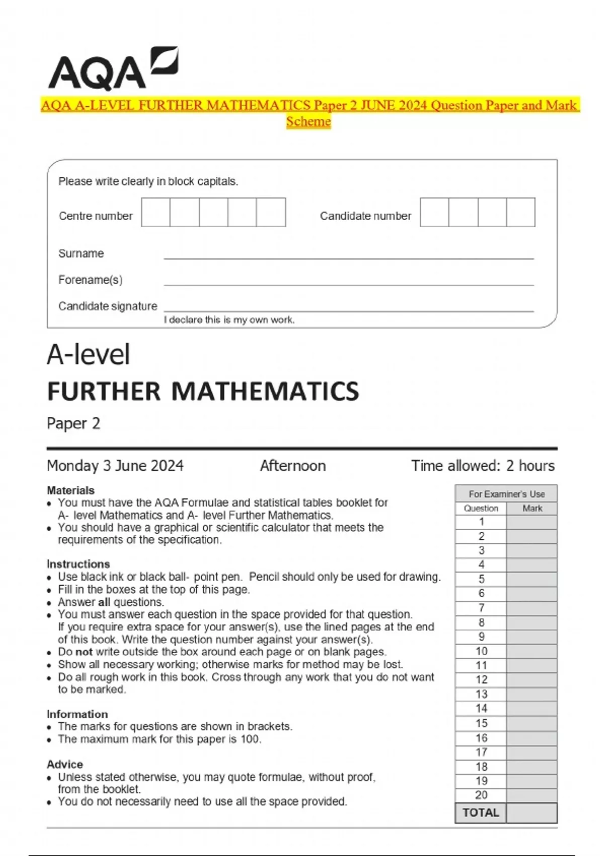 AQA A-LEVEL FURTHER MATHEMATICS Paper 2 JUNE 2024 Question Paper and Mark Scheme