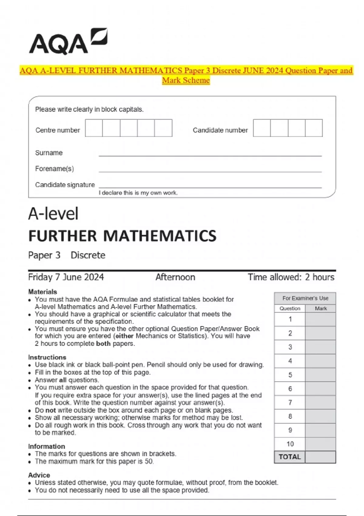 AQA A-LEVEL FURTHER MATHEMATICS Paper 3 Discrete JUNE 2024 Question Paper and Mark Scheme