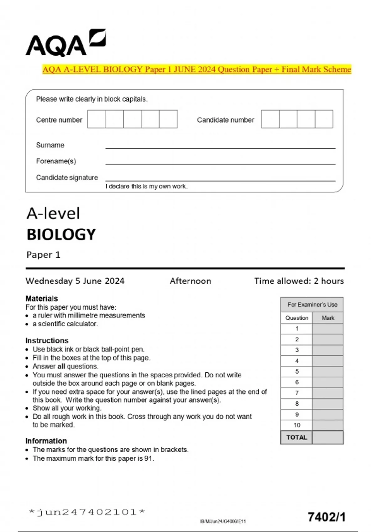 AQA A-LEVEL BIOLOGY Paper 1 JUNE 2024 Question Paper + Final Mark Scheme