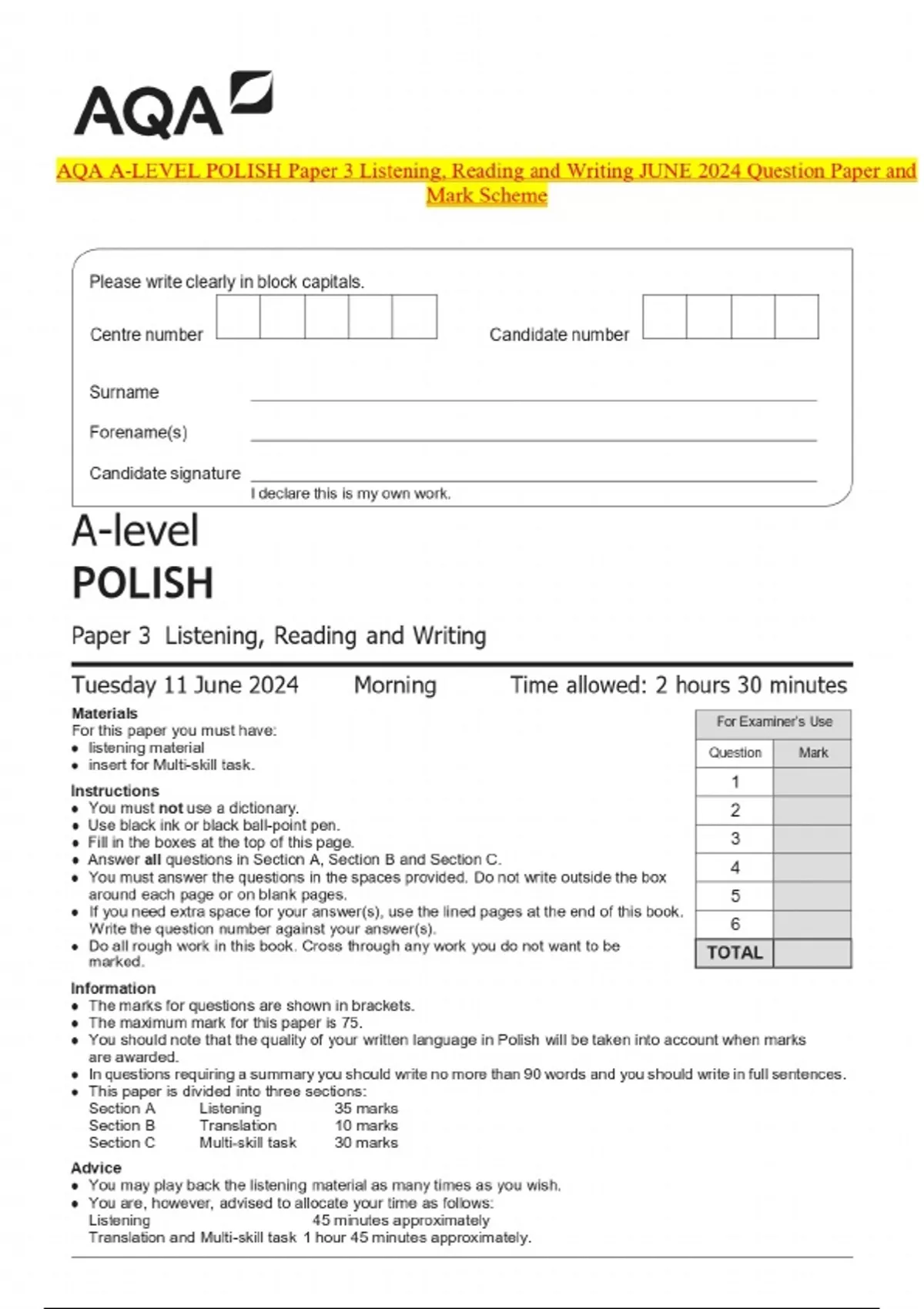 AQA A-LEVEL POLISH Paper 3 Listening, Reading and Writing JUNE 2024 Question Paper and Mark Scheme