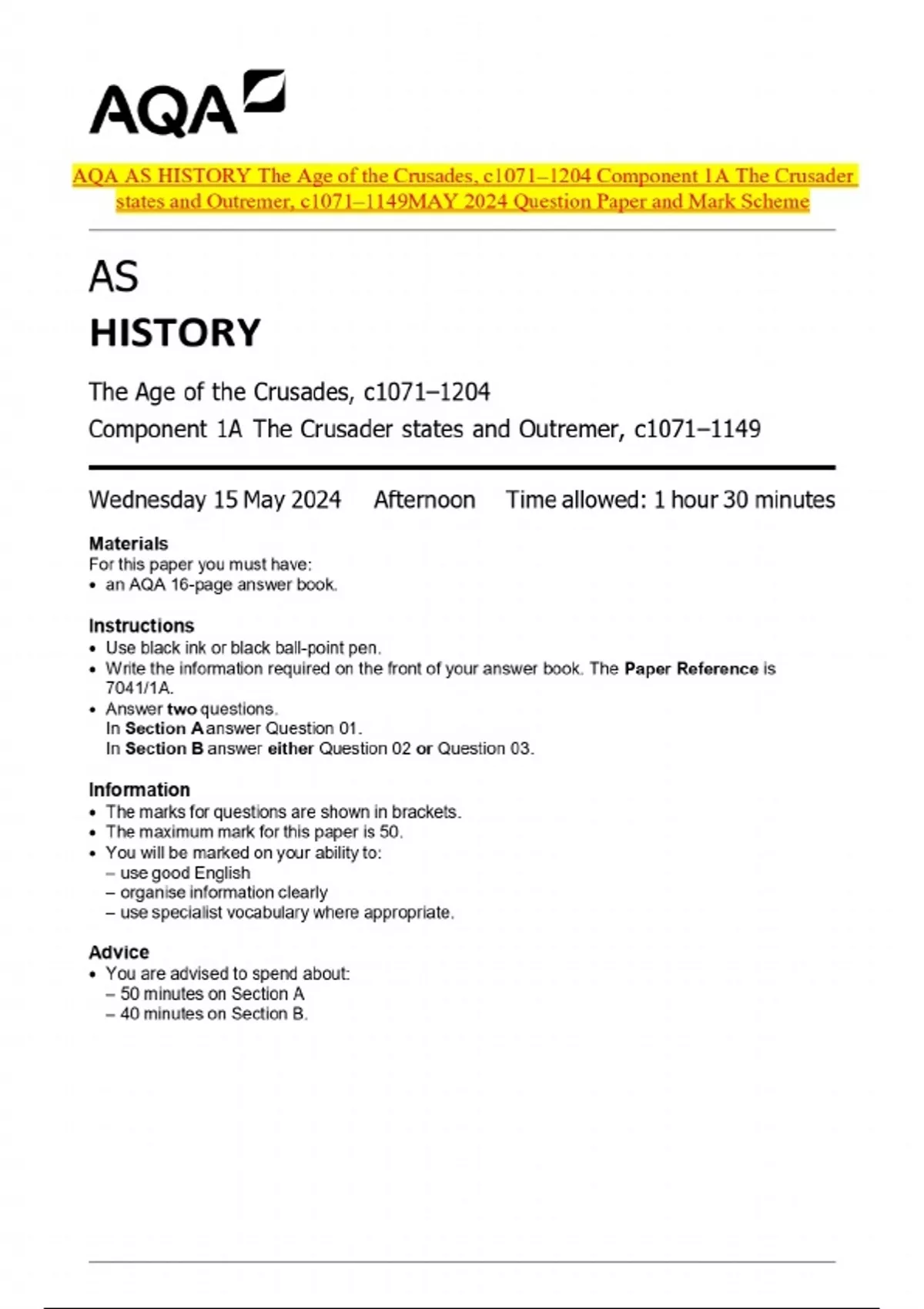 AQA AS HISTORY The Age of the Crusades, c1071–1204 Component 1A The Crusader states and Outremer, c1071–1149MAY 2024 Question Paper and Mark Scheme
