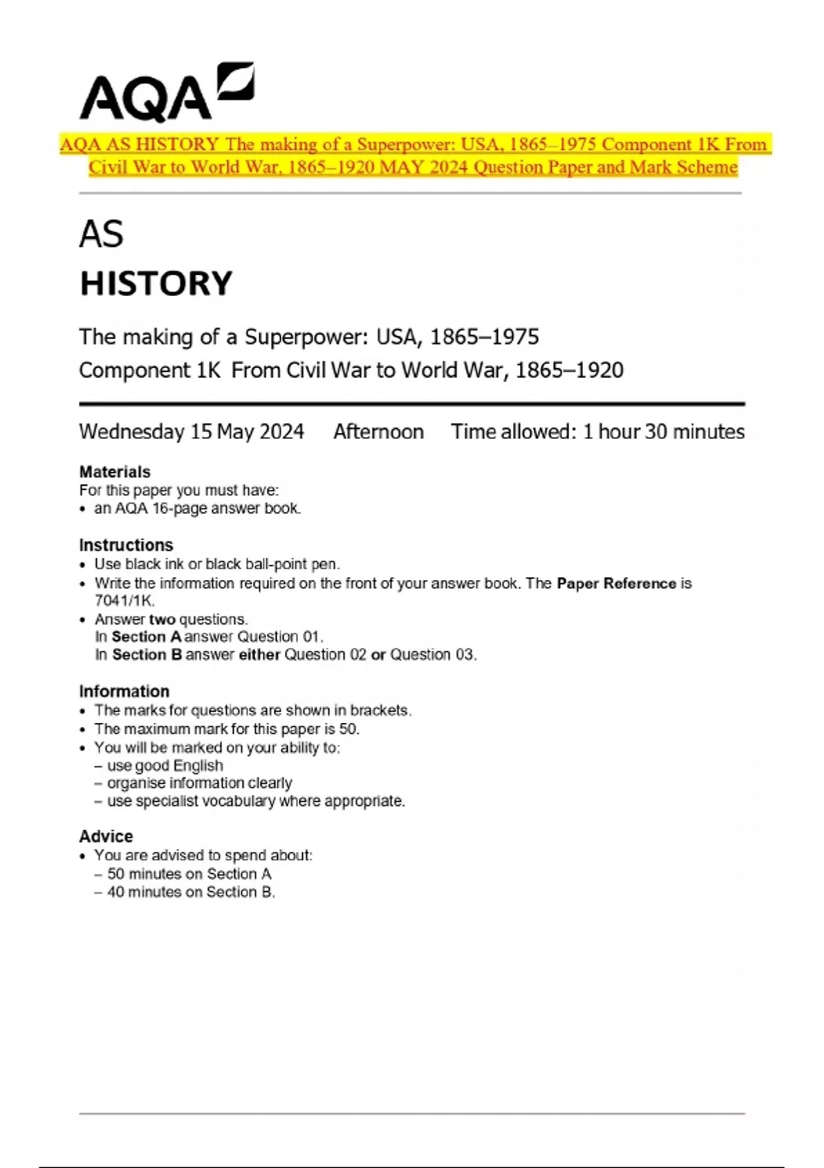 AQA AS HISTORY The making of a Superpower: USA, 1865–1975 Component 1K From Civil War to World War, 1865–1920 MAY 2024 Question Paper and Mark Scheme