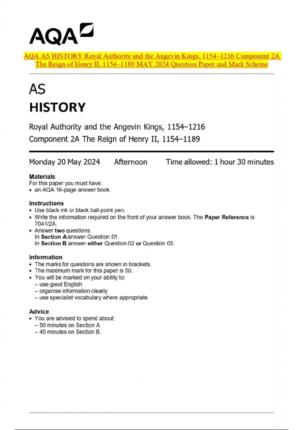 AQA AS HISTORY Royal Authority and the Angevin Kings, 1154–1216 Component 2A The Reign of Henry II, 1154–1189 MAY 2024 Question Paper and Mark Scheme