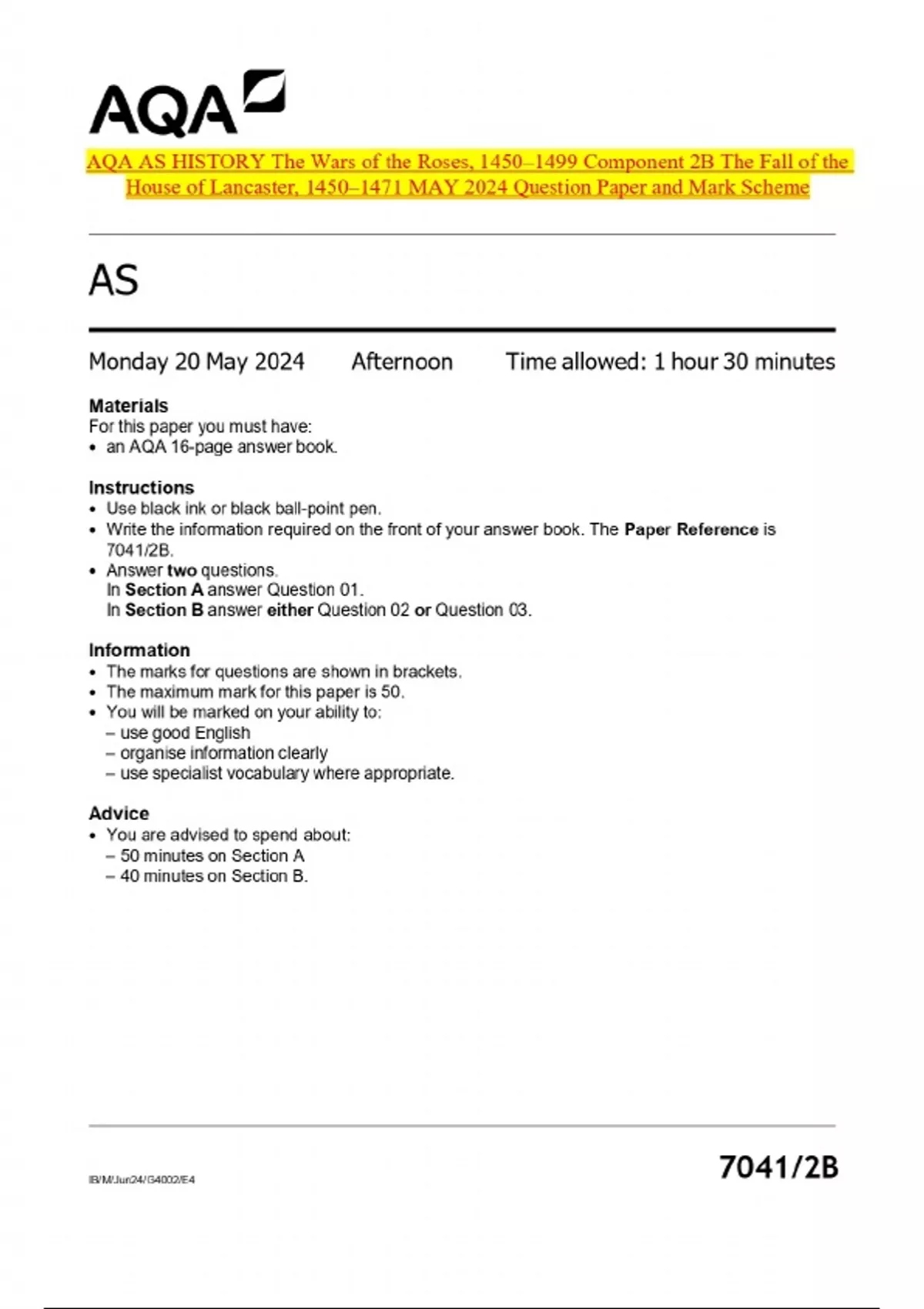 AQA AS HISTORY The Wars of the Roses, 1450–1499 Component 2B The Fall of the House of Lancaster, 1450–1471 MAY 2024 Question Paper and Mark Scheme