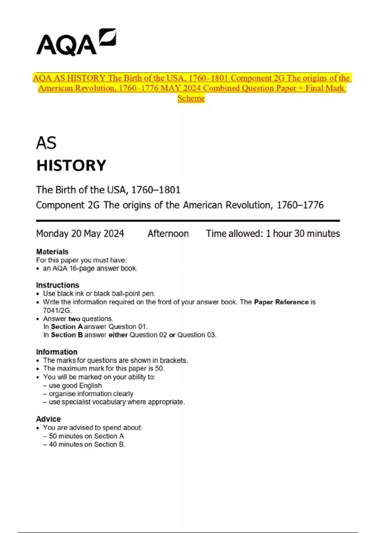 AQA AS HISTORY The Birth of the USA, 1760–1801 Component 2G The origins of the American Revolution, 1760–1776 MAY 2024 Combined Question Paper + Final Mark Scheme