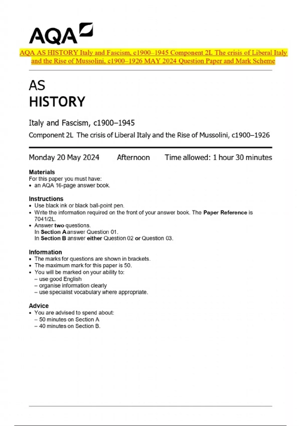 AQA AS HISTORY Italy and Fascism, c1900–1945 Component 2L The crisis of Liberal Italy and the Rise of Mussolini, c1900–1926 MAY 2024 Question Paper and Mark Scheme