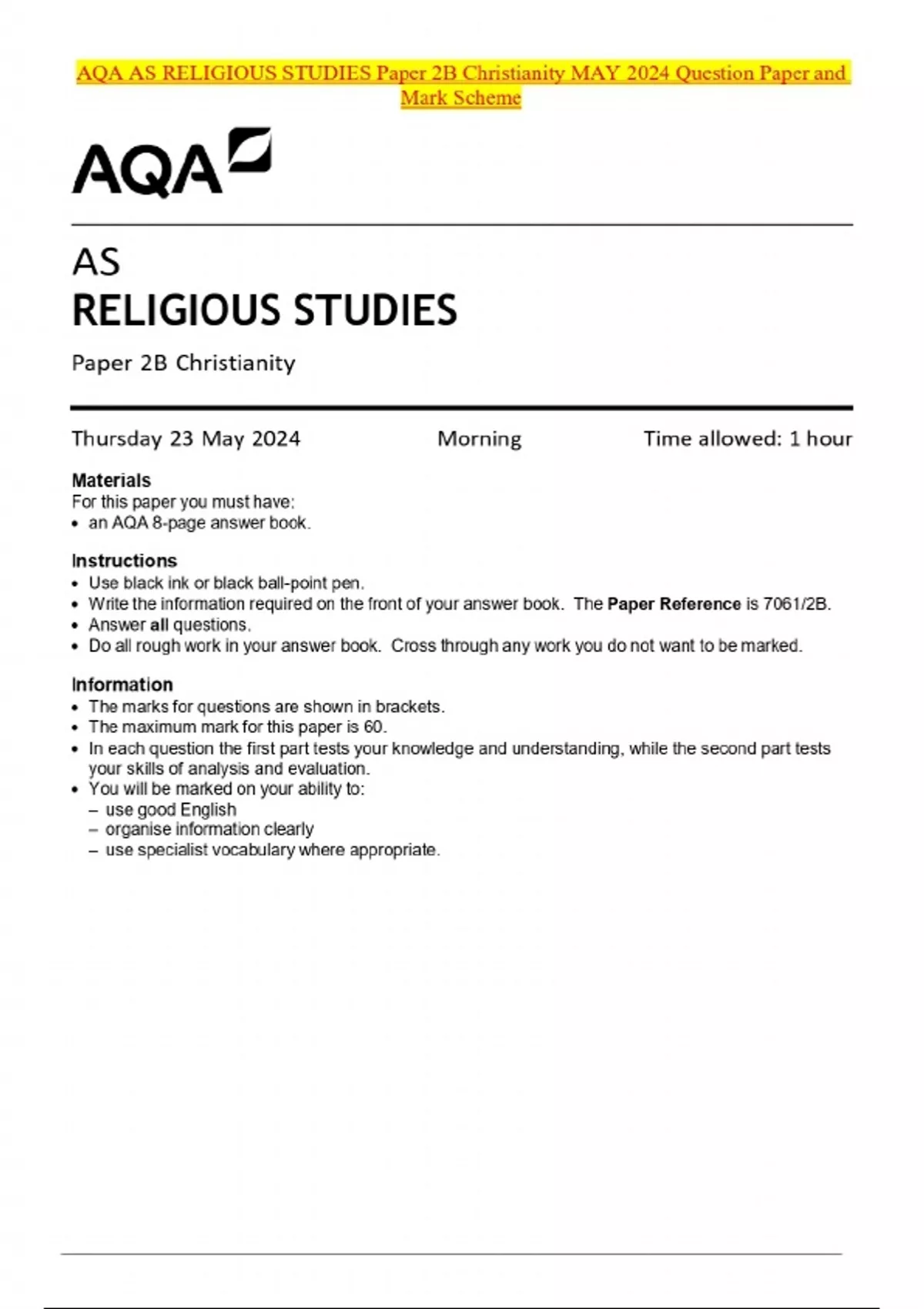 AQA AS RELIGIOUS STUDIES Paper 2B Christianity MAY 2024 Question Paper and Mark Scheme