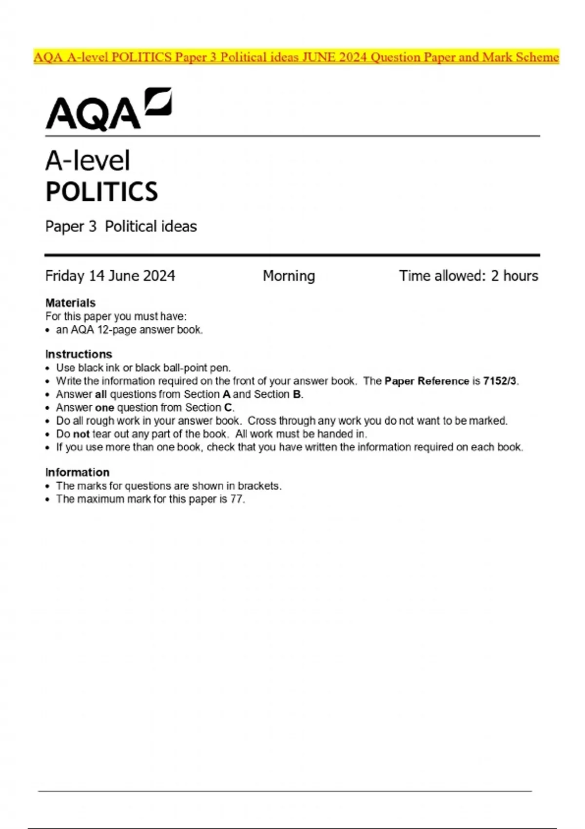 AQA A-level POLITICS Paper 3 Political ideas JUNE 2024 Question Paper and Mark Scheme